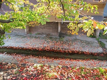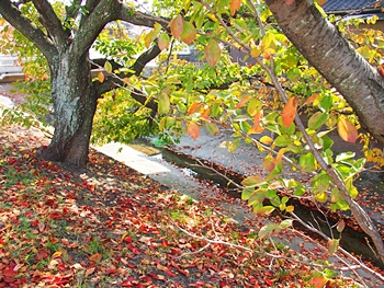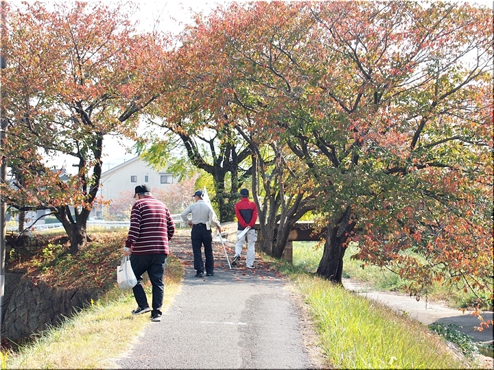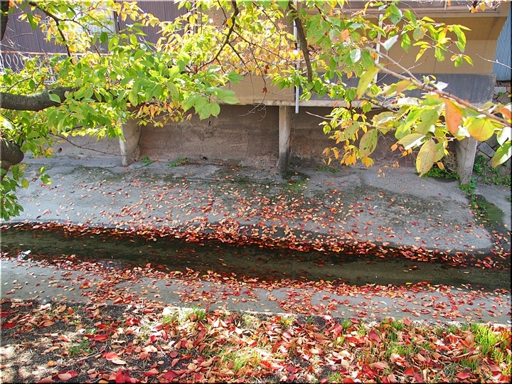サクラ並木の紅葉が大変キレイ。土手の斜面・水呑川に多数の落葉。これまた鮮やかで大変キレイでありました(^-^)//"