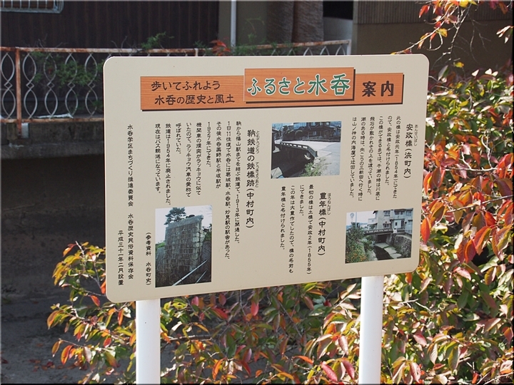 中村集会所近くの豊年橋≠ワでヤッて来ますと、土手脇に設置されました「ふるさと水呑∴ト内」で、安政橋∞豊年橋∞鞆鉄道鉄橋跡=c等の説明がありました。
