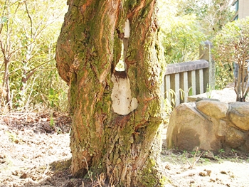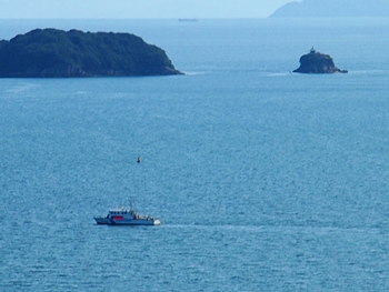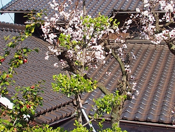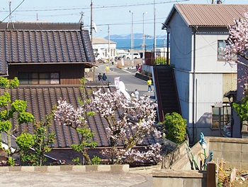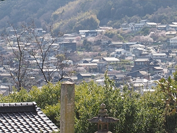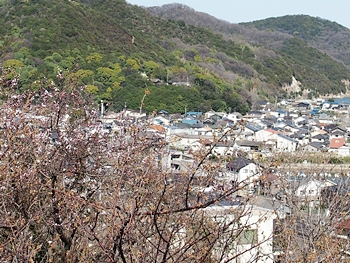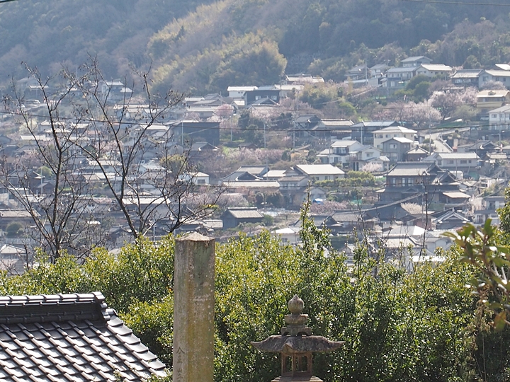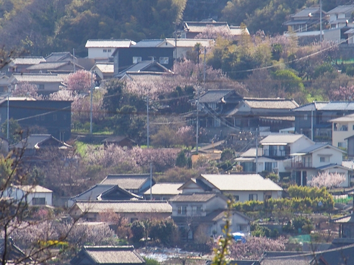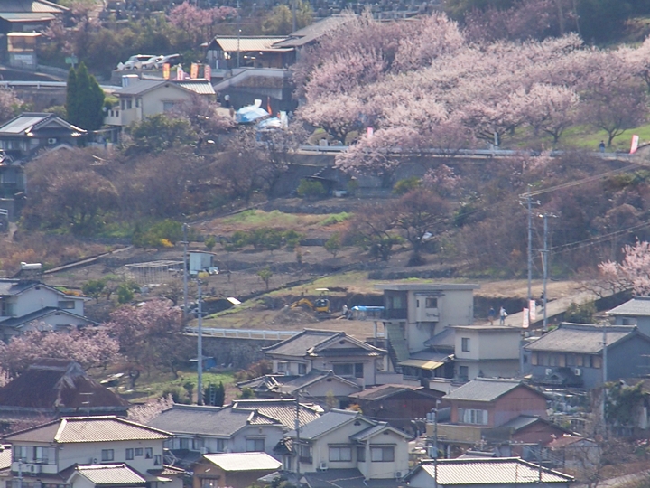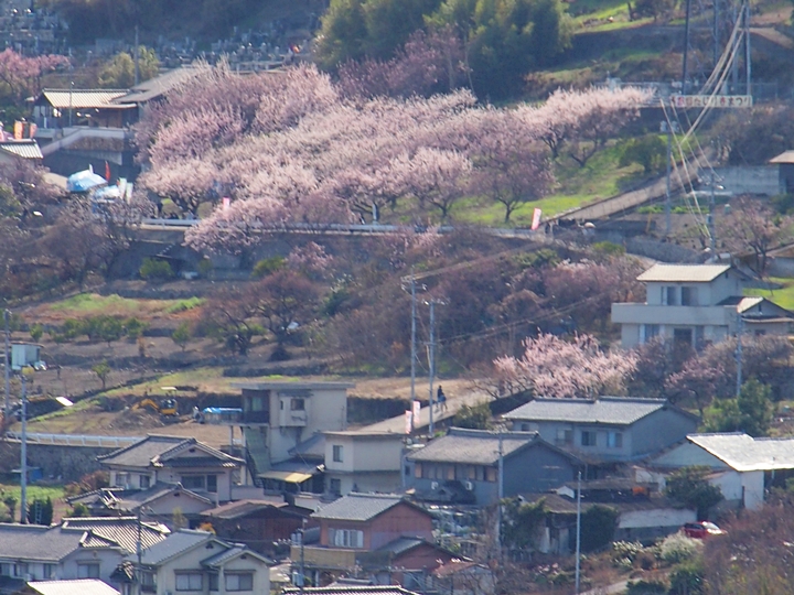 こぅして見ますと、やはり杏品種比較試験地≠ェ本数が多いだけに随分目立ちます。澄みきった青空の下でしたら、瀬戸内の青と杏のピンクが映えますのでしょうねぇ〜