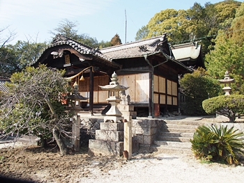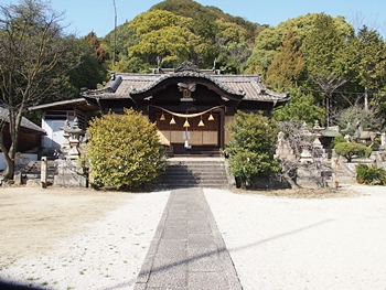 由緒:王ケ峯の山腹に在り、神武天皇を始め仲哀天皇・応神天皇・神功皇后の四柱を祀っています。この社はもと「武の御宮」と称し、創祀はすこぶる古いのですが、永禄3年(1560)の再興以前の詳細は不明です。