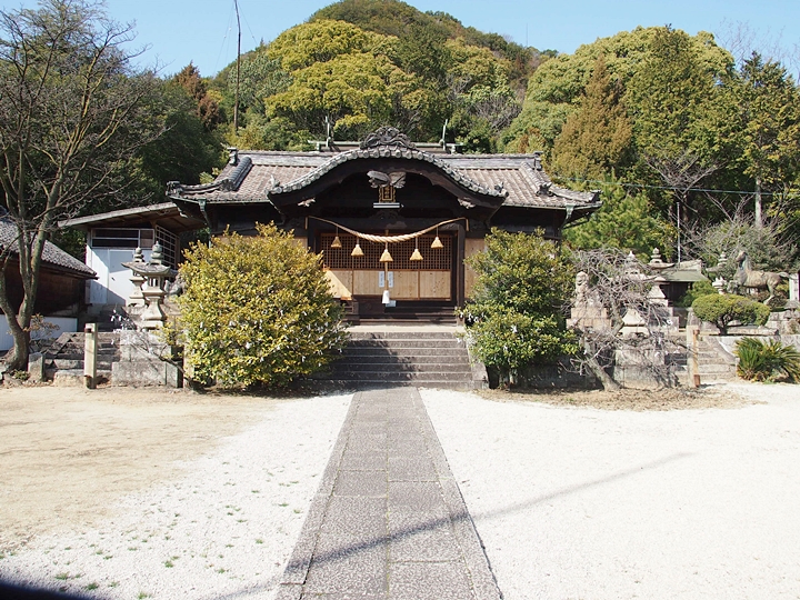 石段の参道を上り詰めると神門があり、それをくぐると拝殿。拝殿の前に昭和30年(1955年)9月建立の狛犬がある。本殿脇に備前焼の頭部のみの狛犬がある。
