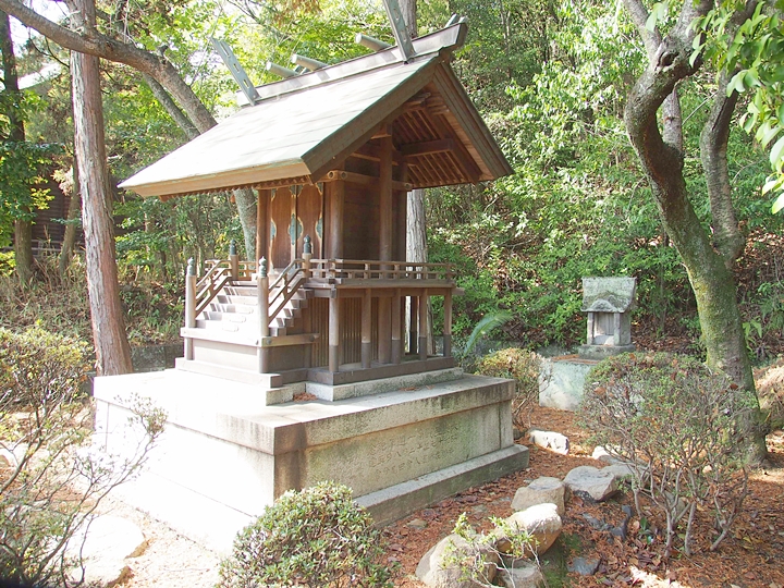そのため、神武天皇が東遷を完了した後、当地の住民が誠意を表して、王ケ峯の山腹の現在地に社殿を営み、遺蹟を称えたと考えられている。