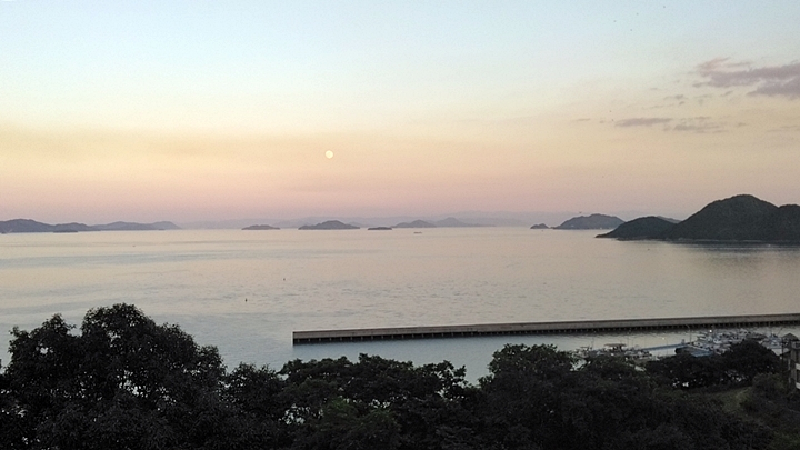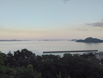 東方の笠岡諸島方向に、お月様が…ヒマですから、何枚かパチリ。弁天島方向も数枚パチリ。弁天島のズッと後方には四国山地が…