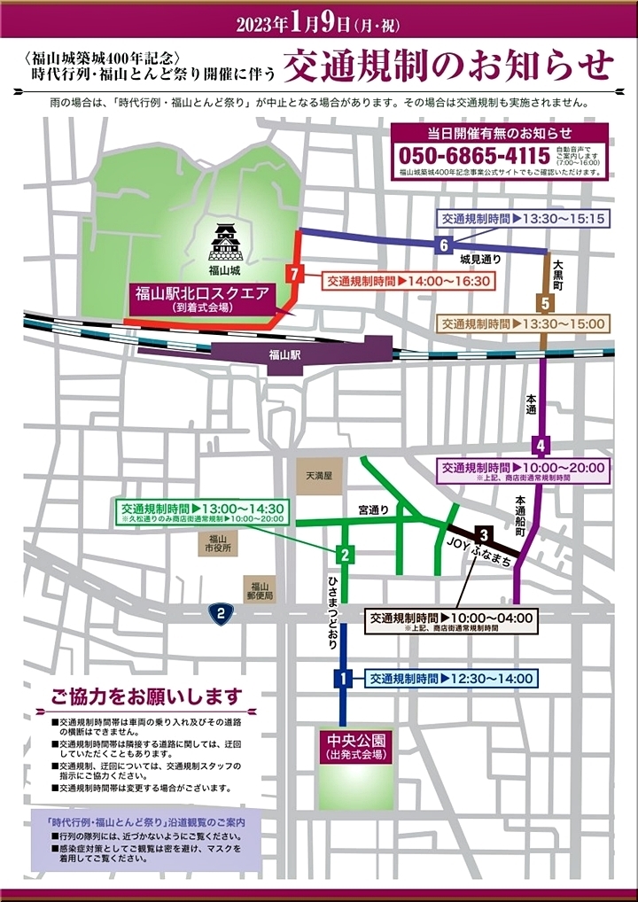 【行列コース】<出発>中央公園--ひさまつ通り--宮通り--JOYふなまち--本通り--大黒町--城見通り--<到着>福山駅北口スクエア(予定)