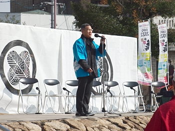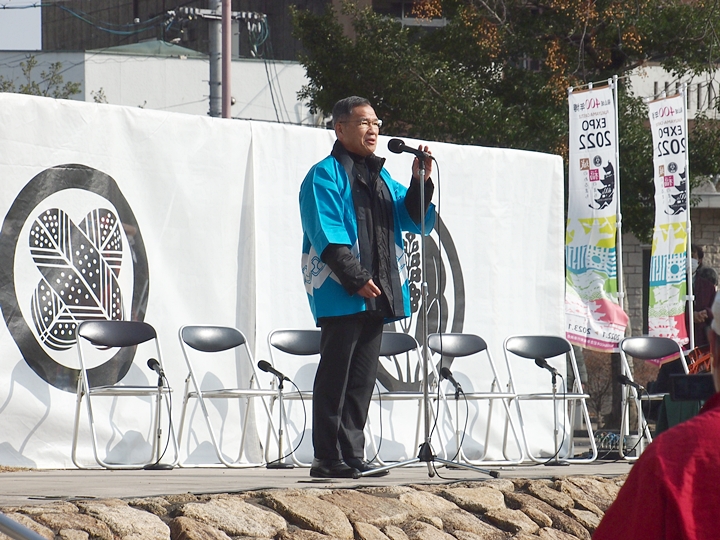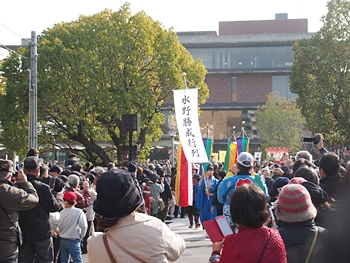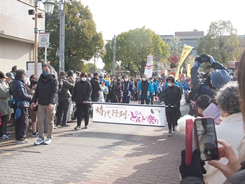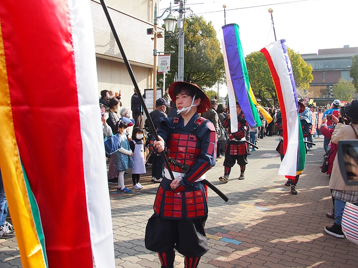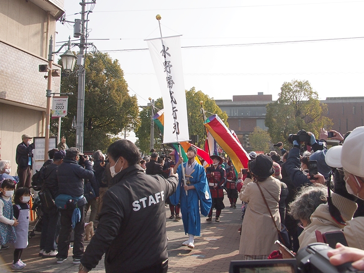 はじめに福山藩の初代藩主、水野勝成役を務める福山城の応援サポーターで声優の福山潤さんが「皆の者、出陣じゃ」とかけ声をあげて行進がはじまりました。