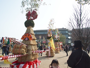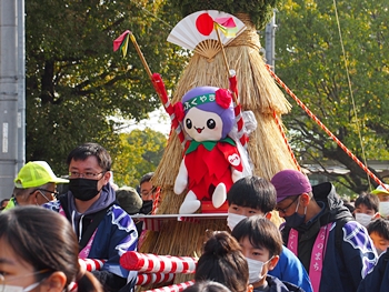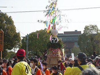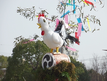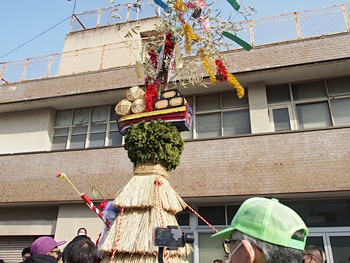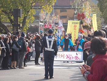 長い竹を円錐型などに組み立て、そこで正月飾りや書初めなどを焼くことで無病息災などを願うとんど。焼いている時に竹がはじける音からこの名が付いたとか。福山では福山城築城を祝い、竹のてっぺんに豪華な飾りを付けたとんどを担いで城下を練り歩いたのが始まりといわれています。とんどの点火式は迫力満点!色々な意匠を凝らした飾り付けをしたとんどが連なって、町中をとんど音頭を歌いながら練り歩く行進も計画中。