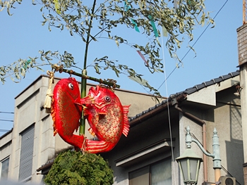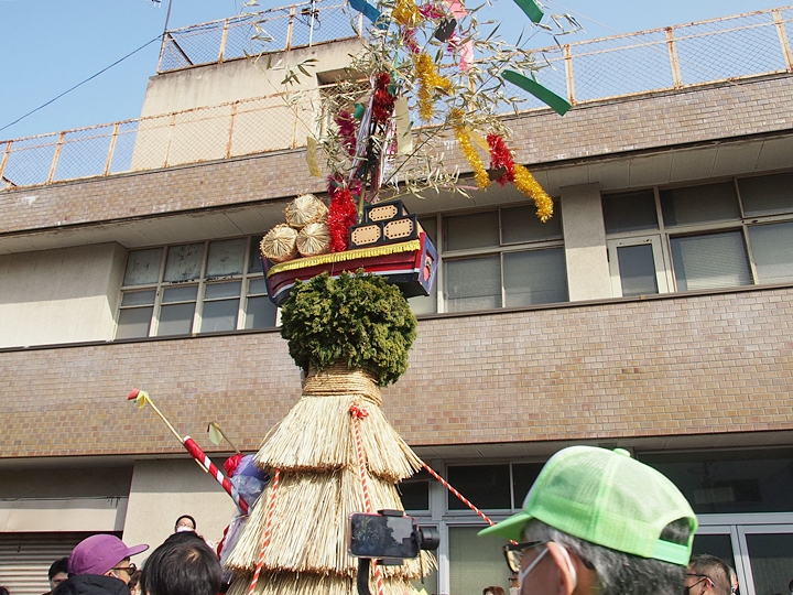江戸時代、とんどを担ぎながら町中を練り歩く福山とんどは勇壮かつ華やかで「日本一のとんど」と言われました。勝成公は特に吉津町の鶴亀とんど、上魚屋町の懸け鯛、笠岡町の諌鼓鶏、船町の宝船、下魚屋町の三方に伊勢海老という5つの町の飾りを褒めたので、以来、これらの町は同じ意匠を400年間作り続けています。