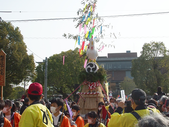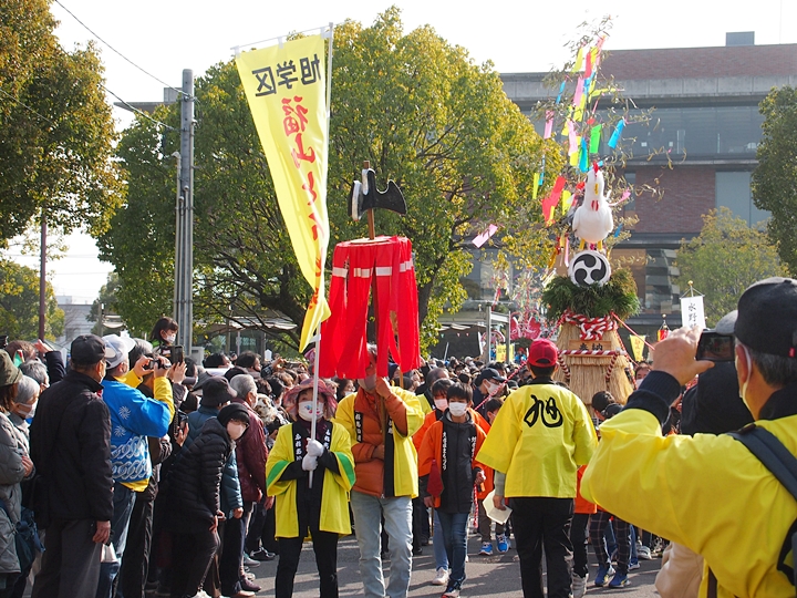 行列の前後には、福山城の築城を祝って始まったとされる伝統の「福山とんど」も加わり、子どもたちが高さおよそ3メートル、あわせて8基のとんどを引いて進んでいきました。