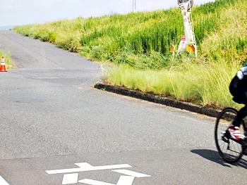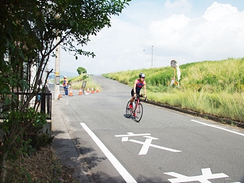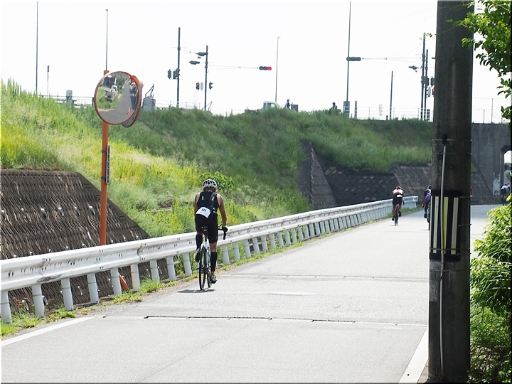 まぁそぅですネ、普通、こぅしたコース変更箇所には、『コース →→』のような案内表示板を設置しますけど、今大会では、何故か設置がありません。土手から下ります箇所にも、下って来ました土手下にも(^-^;