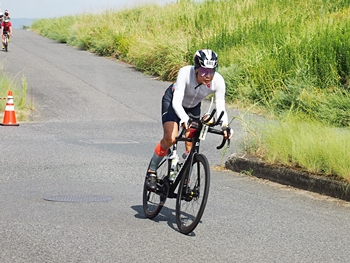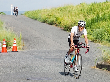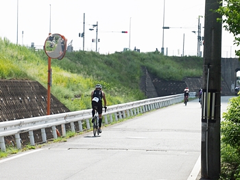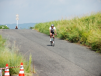 土手下の元の場所に戻り、こぅして暫く通過して行かれます選手の皆様を画像に納めておりますと、土手を走行して来まして、芦田川大橋西詰め下のアンダーパスを潜り抜ける為、土手下に降りて来なければならないのですけど、土手をそのまま直進し芦田川大橋西詰め交差点に向かう選手が(^-^;