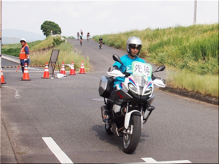 そしてまた、暫く経ますとバイクが…このバイクは先導≠フ表示です。と、言う事は、この先導車の後方に5名の選手の皆様が追走ですから、この方達がトップ集団なんでしょうねぇ〜
