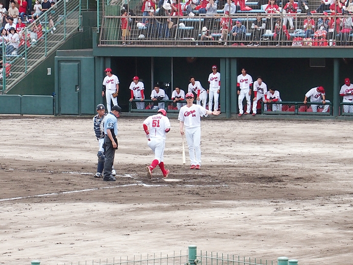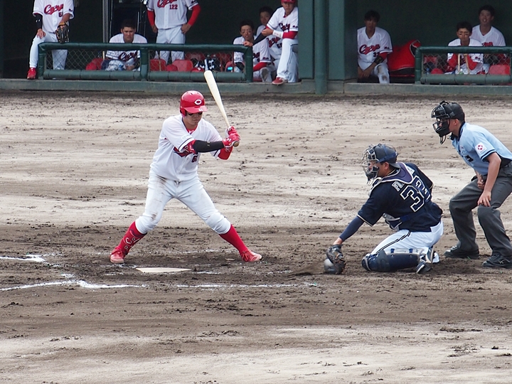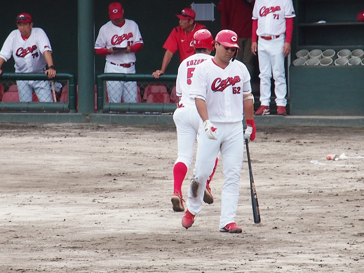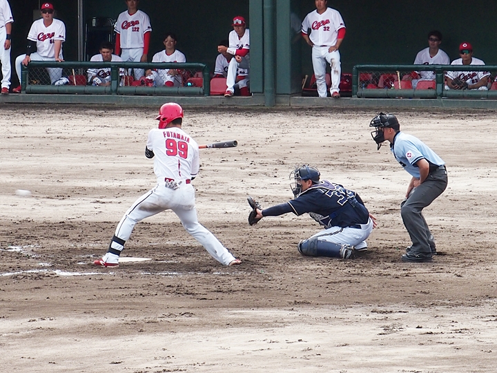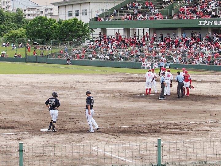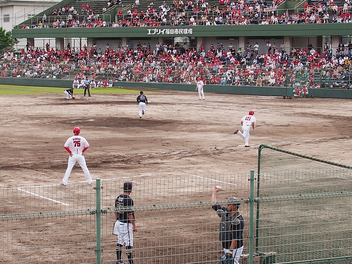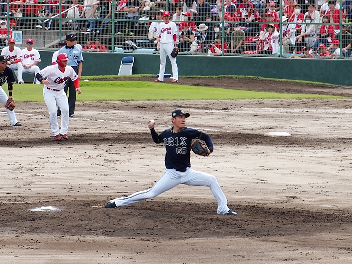 宇草:空振りの三振を喫する 1アウト、小園:2-2からライトスタンドへのホームラン 広1-6オ、末包:デッドボールを受ける 1塁、清水:石原→代打:清水 レフトへのヒットで出塁 1,2塁、二俣:投手交代:村西→吉田 空振り三振 2アウト、前川:ファウルフライを元(三)が掴んでバッターアウト 3アウト