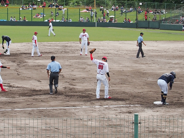福永:投手交代:行木→高橋 守備変更:中村健→センター 外角低めのストレートを打つもセンターフライ 1アウト、上野:ストレートのフォアボールを選ぶ 1塁、渡部:サードゴロ 2アウト1塁、山足:外角の真っ直ぐを打つもライトフライ 3アウト