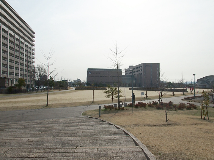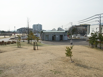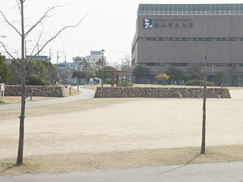 福山みなと公園≠フグランドに眼を向けますと、グランドを二分するような感じで石垣が設置されています。
