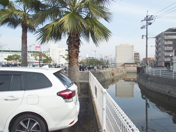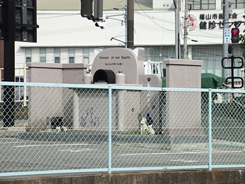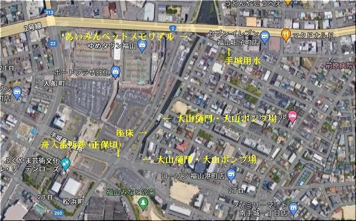吉津川と手城川の分岐点からは、手城川に沿って洋服の青山本社方向に少し進み、右折し、福山みなと公園方向にと戻って行きますと、右手に港町公園≠ナす。