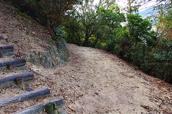 段々を上がると平坦地となりましたけど、その先には、またまた通行禁止≠フ案内標識です。標識を前に前方に眼を向けますと、山の斜面が崩壊で、その修復工事中のようにも思えます。
