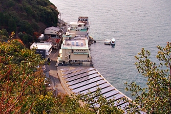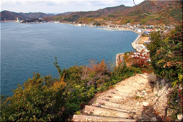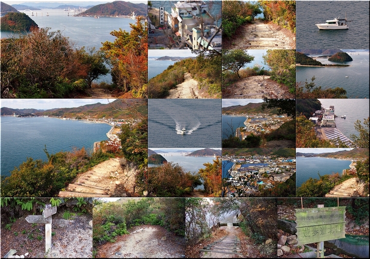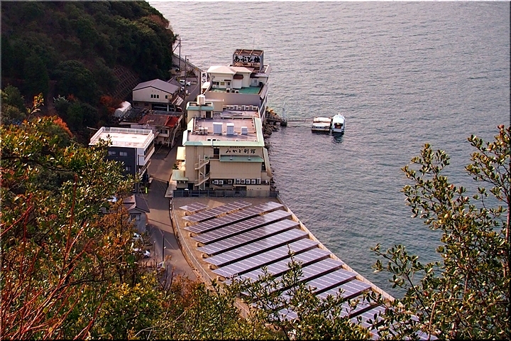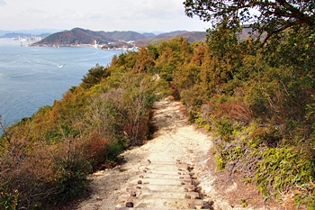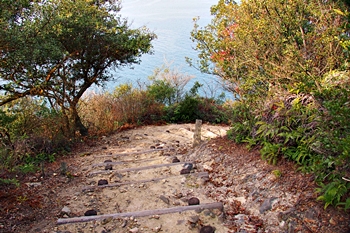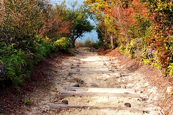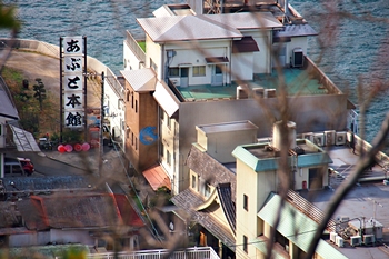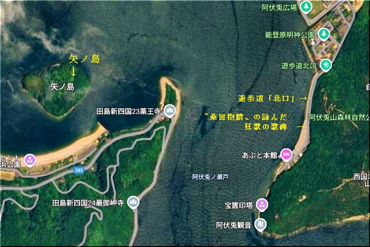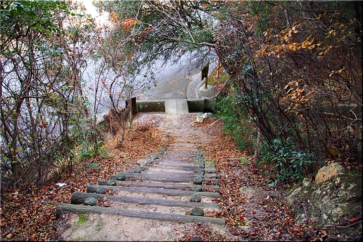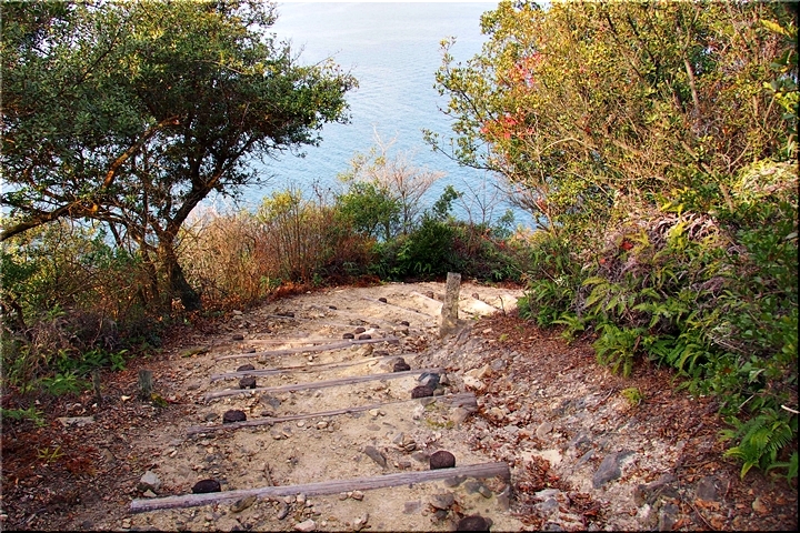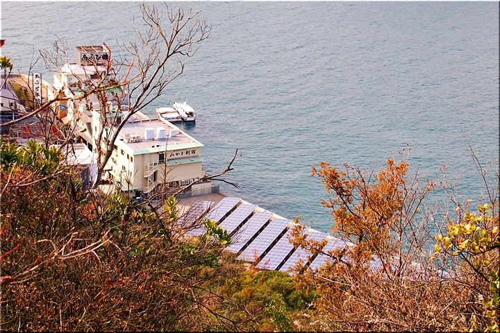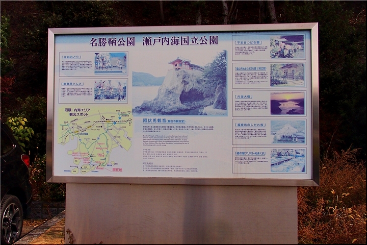 この方達を横目に阿伏兎海岸を進んで行きますと、あぶと本館≠ワでヤッて来ました。このまま直進し300mばかり進みますと阿伏兎観音(磐台寺)≠ナすけど、今回はあぶと本館≠フ山際に遊歩道西口≠ェありますから、この西口から尾根歩き遊歩道≠ノ戻りたいと思います。