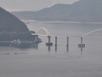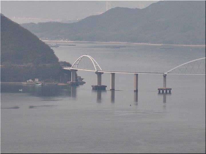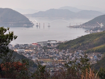 鞆鉄鋼団地付近から福山グリーンラインに上がり、阿伏兎山森林公園方向に走行し南下。途中、後地朝陽展望台≠ノ立ち寄り、仙酔島・鞆港・円福寺方向を眺望です。背面・西方には、内海大橋が…そのズッと後方には、因島大橋の主塔も見えますネ。
