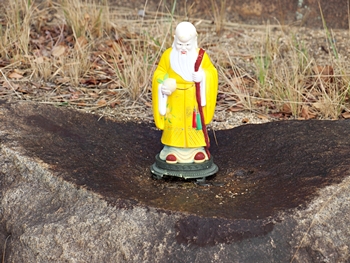 そぅそぅ、この駐車場の一角に、「福山グリーンライン」と刻まれました石碑が存在しますけど、その前に、菩提老祖神像らしき像が置かれておりまして、その足元にはお賽銭が…