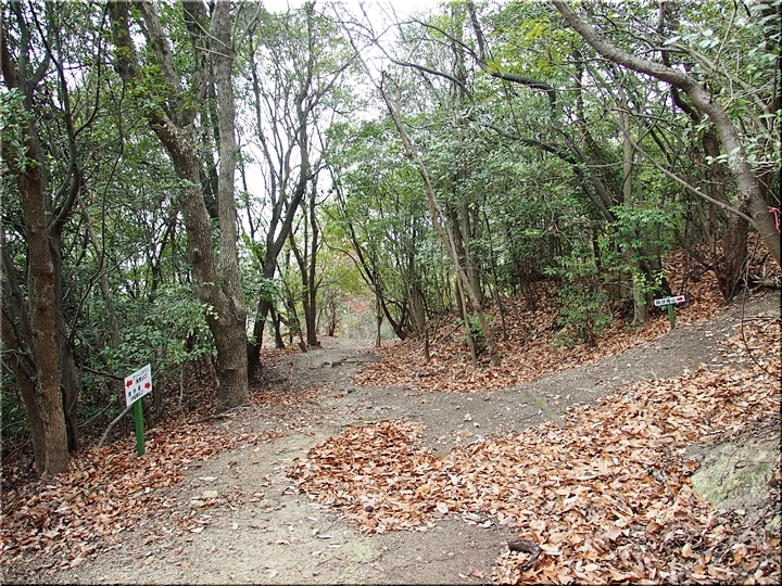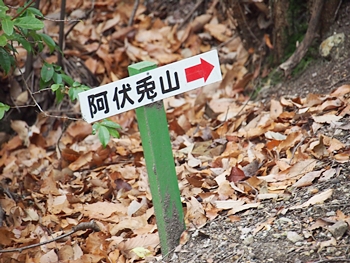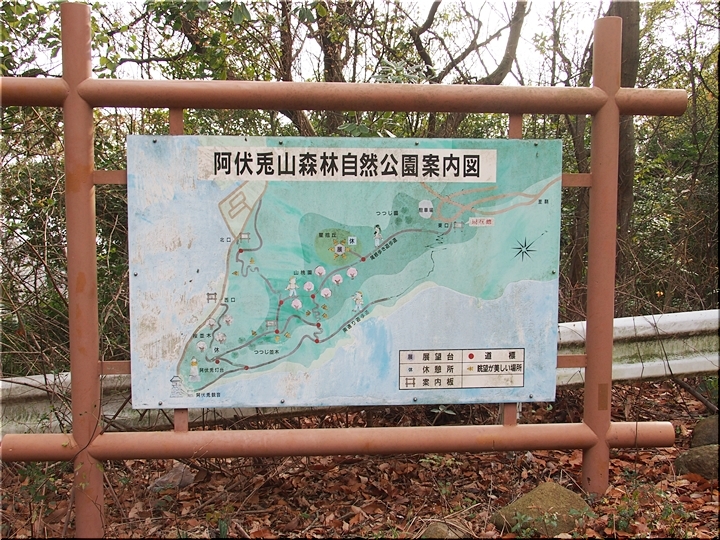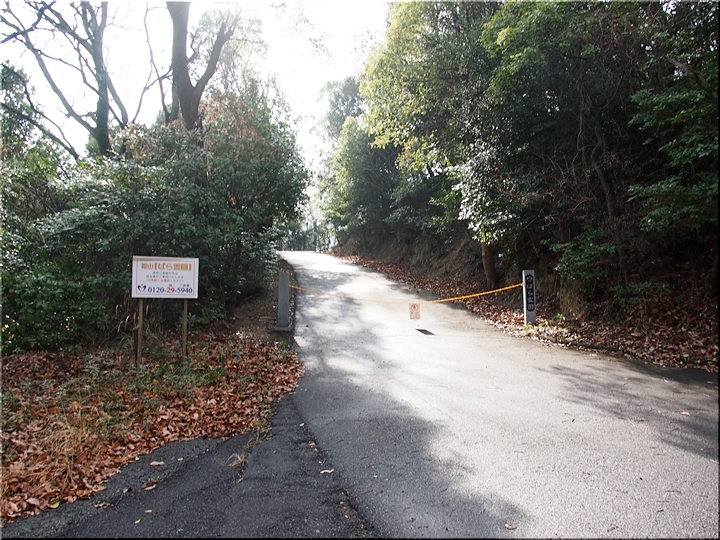 チェーンの張られた入口を進んで行きますと、阿伏兎山森林公園東入口≠フ標識が…直進しますとバラ霊園≠ナ、左に向かいますと阿伏兎山森林公園遊歩道≠ナすから、左方向へ進みますと、また案内標識です。