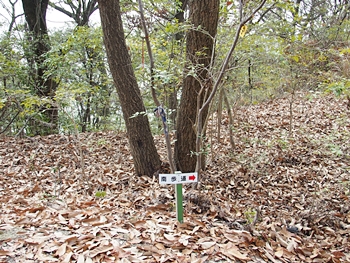 落葉で積み重なった中を不安ながらも進んで行きますと、枝に赤リボンが…これには、ホッと一安心…でしたけど、今度は崖の上に出て来ましたネ。