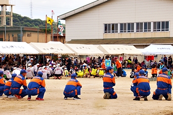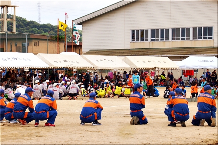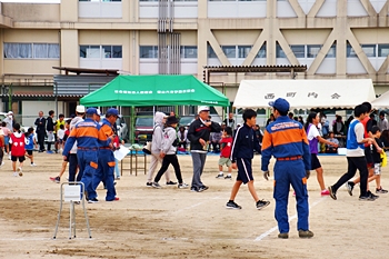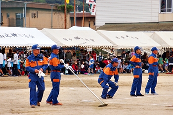 チーム対抗リレーが凡て終わりますと、昼食タイムとなりますけど、その前に、前半のプログラム最後に消防団の皆様による消火演習≠フ種目が残っておりました。
