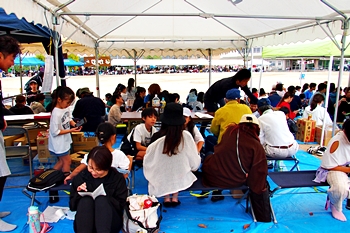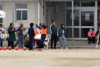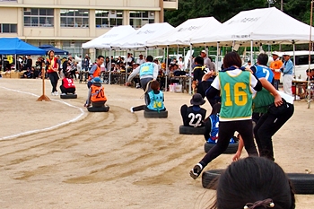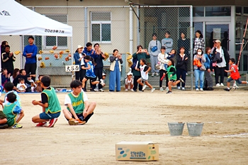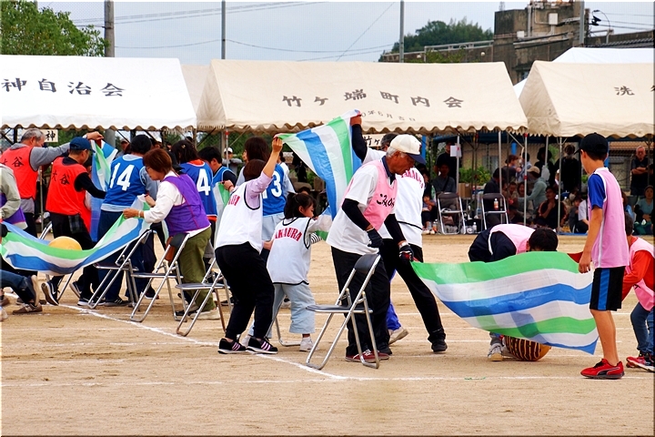 当選番号確認にモタモタしておりましたら、既にボール運びリレー≠ェ始まっておりました。4人で手にしたシートの上にボールを置き、これを運ぶのですけど、簡単そうに思えますのに、これが仲々。ですが、リレーしていく内に次第に皆さんお上手に。