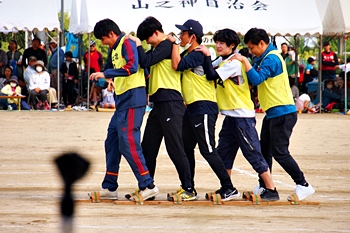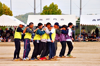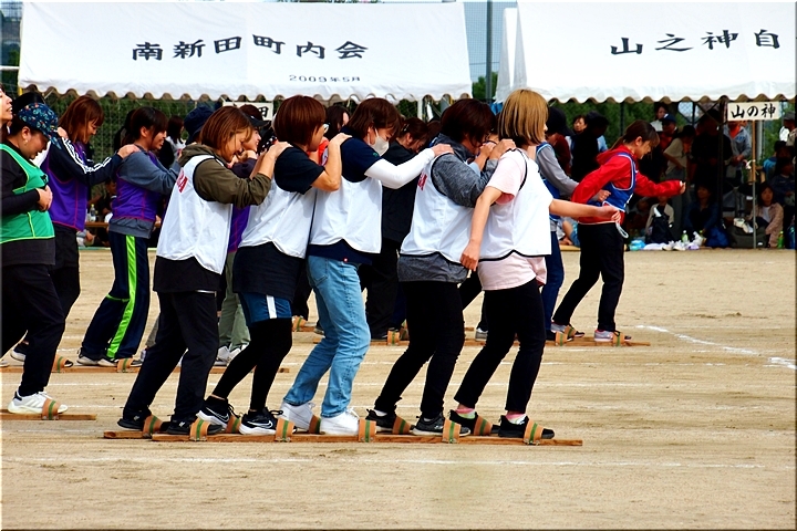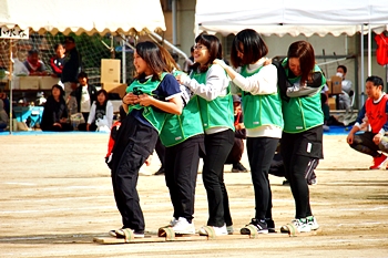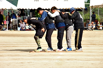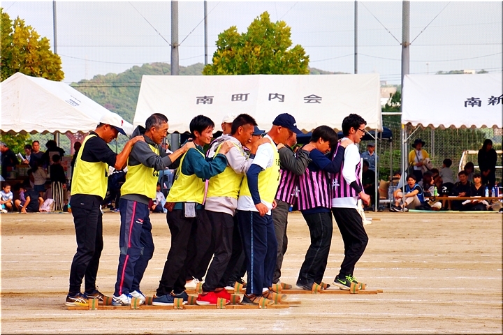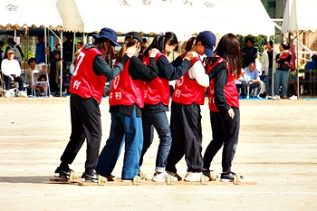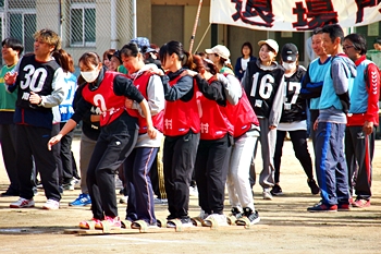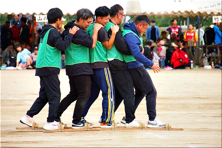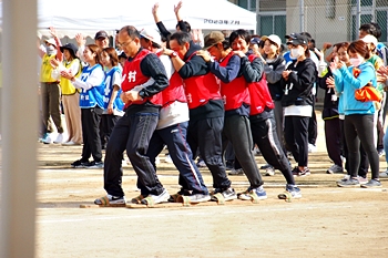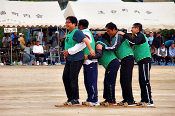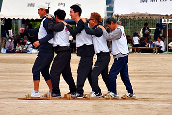 我が中村チームも同様です。危ない!倒れる!!≠ニヒヤッとしますけど、どぅにか持ち堪えます。が、一度バランスを崩しますと、立て直して再び歩みますのに仲々呼吸が合いません。危ないシーンが連続ながらも、どぅにか次に繋ぎますから、やっぱり観戦者には楽しい競技ではあります。