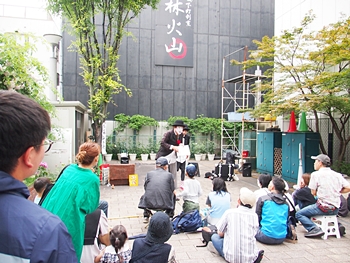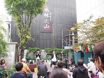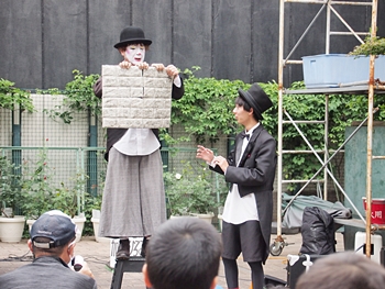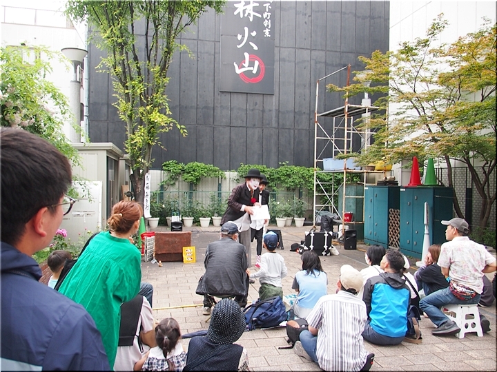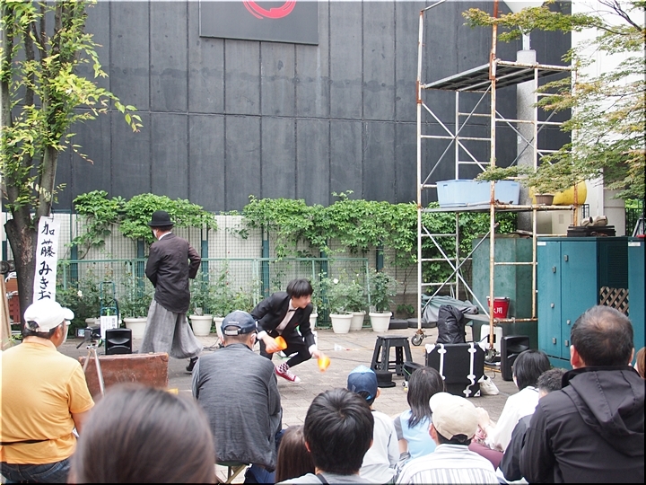 時間を確認しますと、A.M.10:18。大道芸の開始は、A.M.10:15からですから、タイミング良く久松北ポケットパーク≠ナは、「加藤みきお&みちひろ」sanの大道芸の始まりです。
