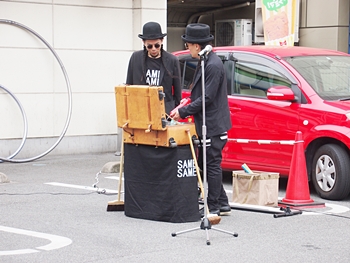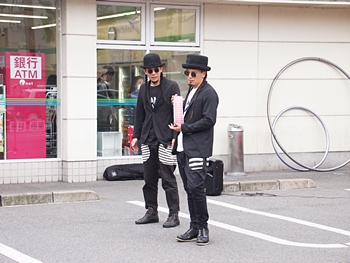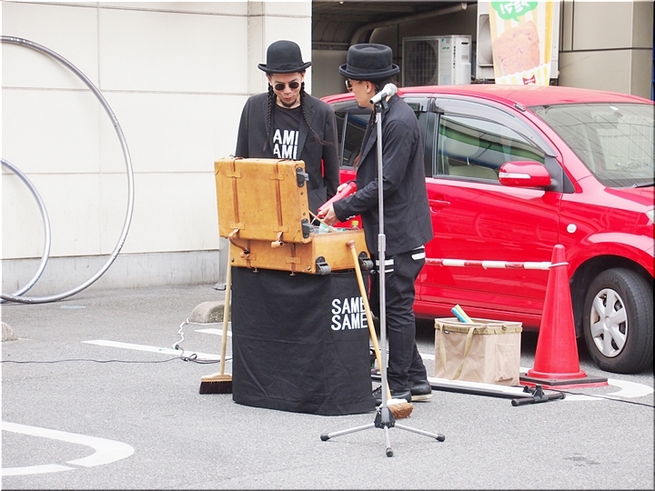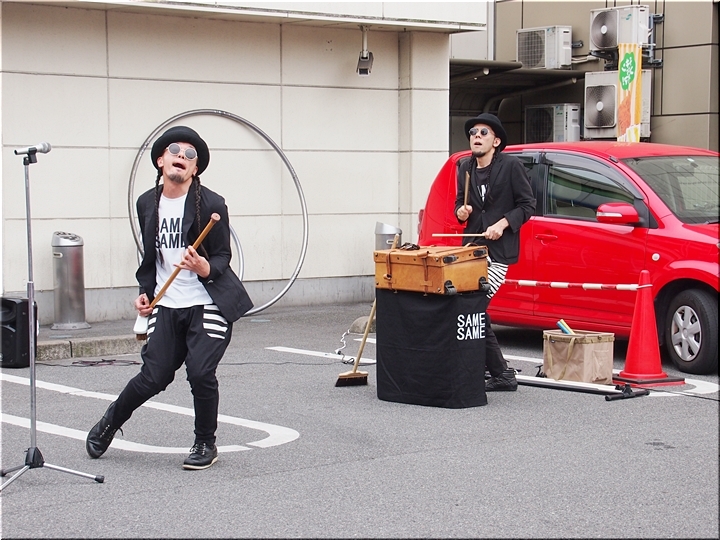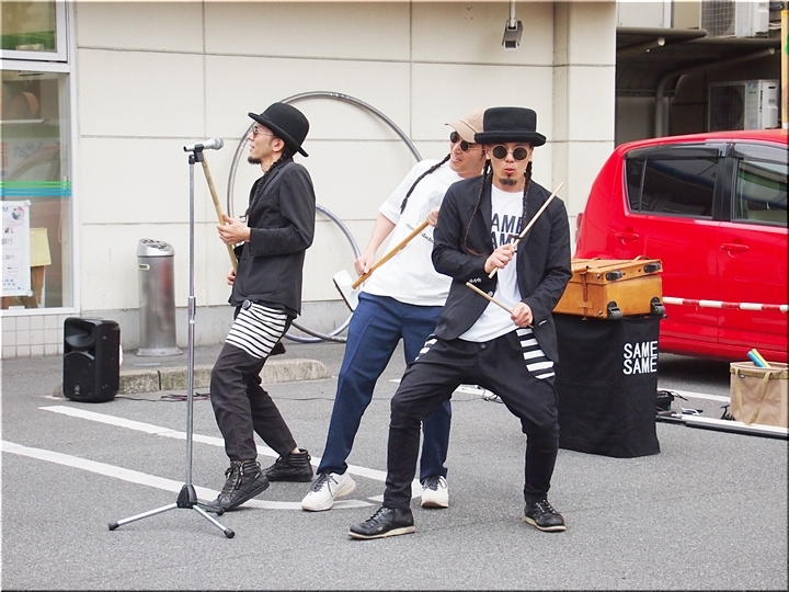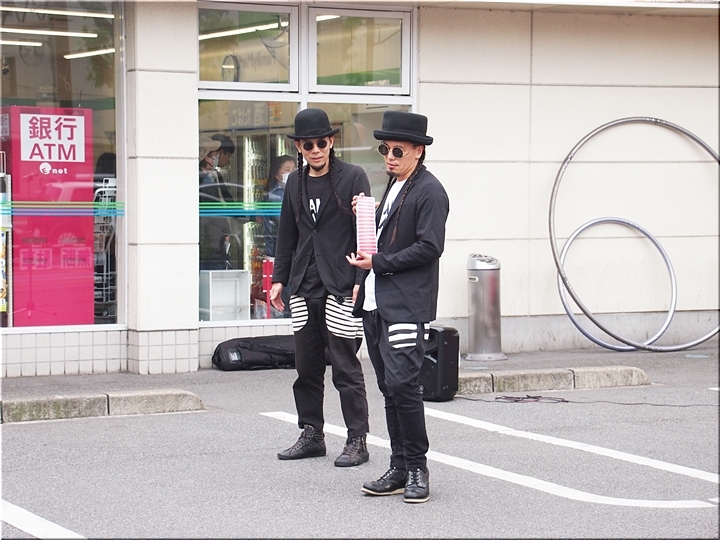 暫し拝見後、また歩行再開です。国道2号線を渡りますと、ファミマ霞町店≠フ駐車場では「SAME SAME」のお二人が熱演中。途中からは観客の若者に手伝って貰っておりましたが、この若者が仲々乗りのイィ方でありまして、エア・ギターもSAME SAME≠フお二人に決して負けていませんで、観客も拍手(^_^)v
