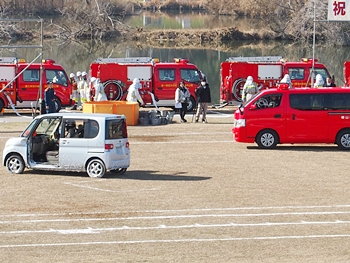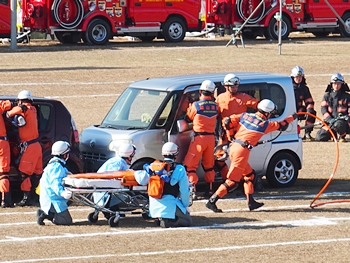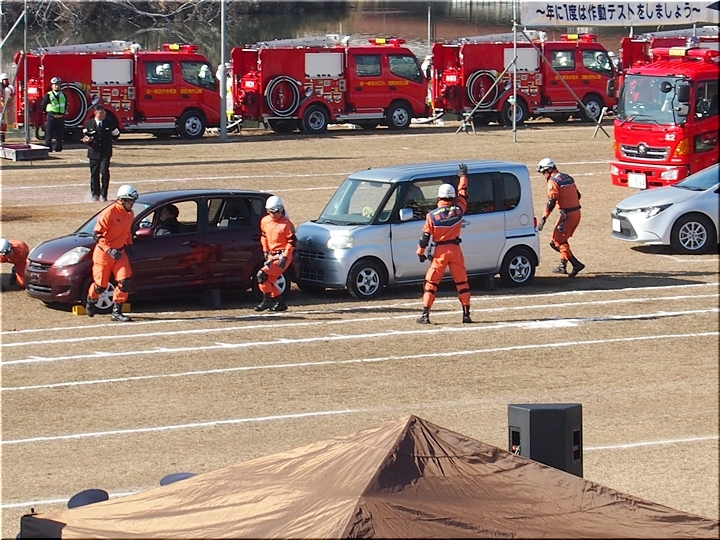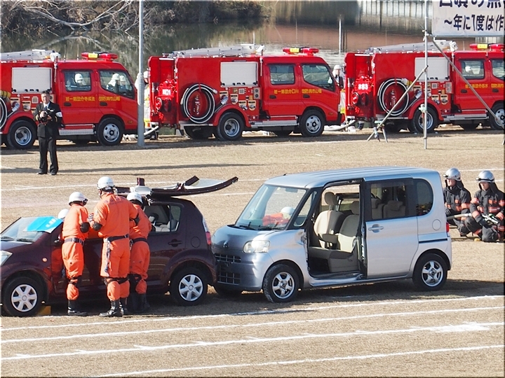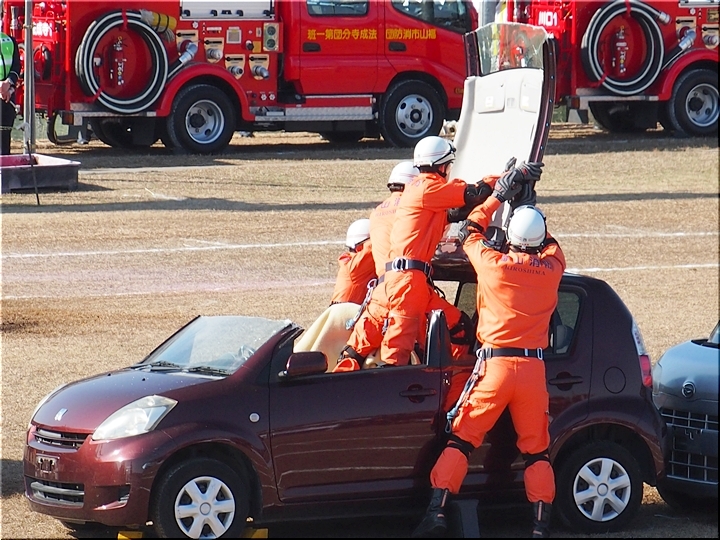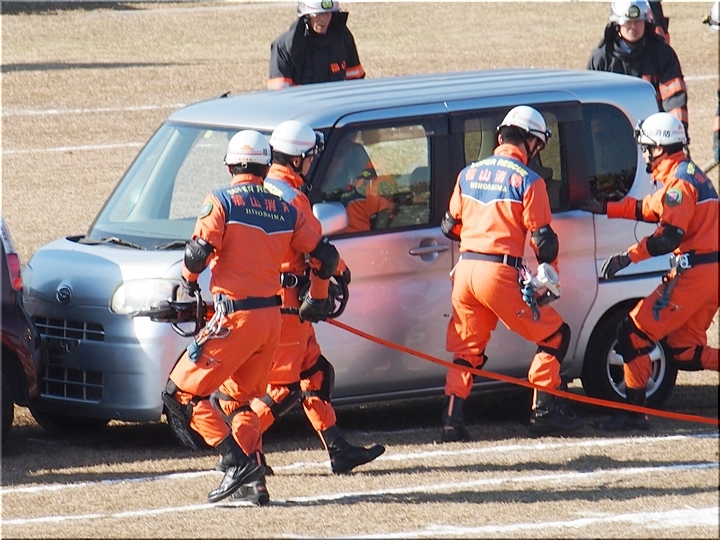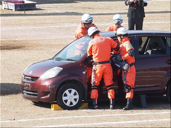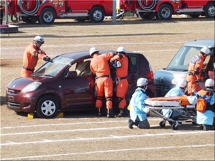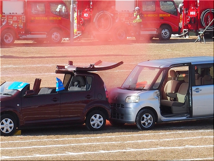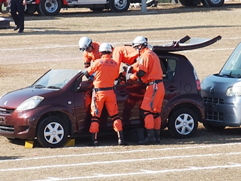 ロックされました車内から、1台はドアを切断し負傷者を救出、もぅ1台は、フロントガラスと屋根部分を切断し分離。そして、負傷者を救出。