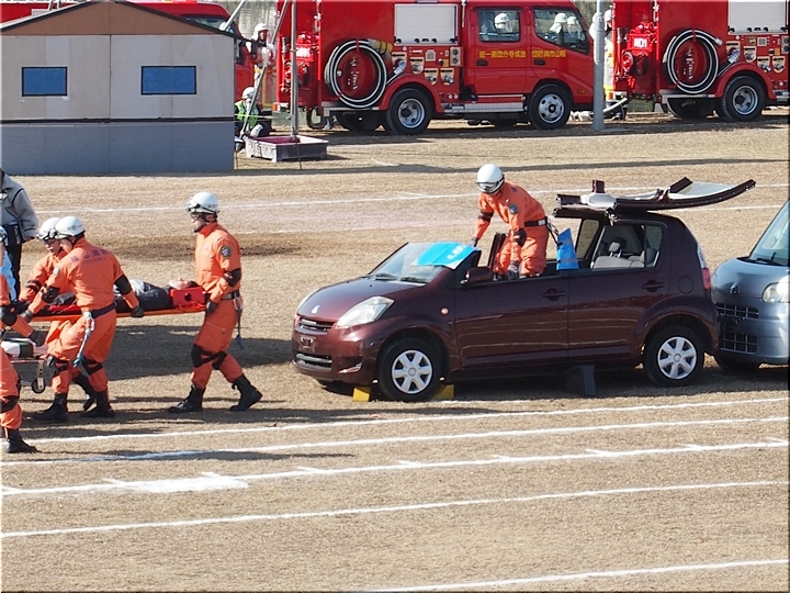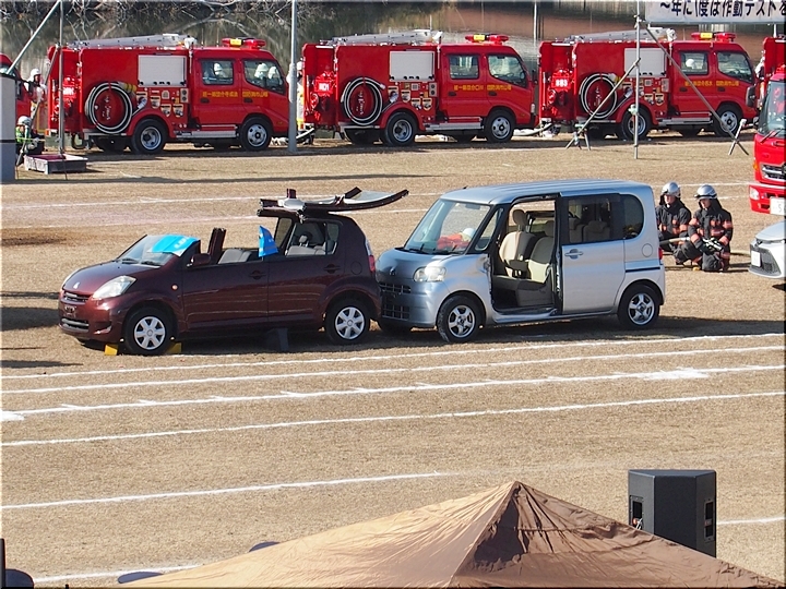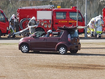 レスキュー隊の皆さんの訓練が終わりますと、屋根を切り取られました車がオープンカーの状態で退場です(^-^)