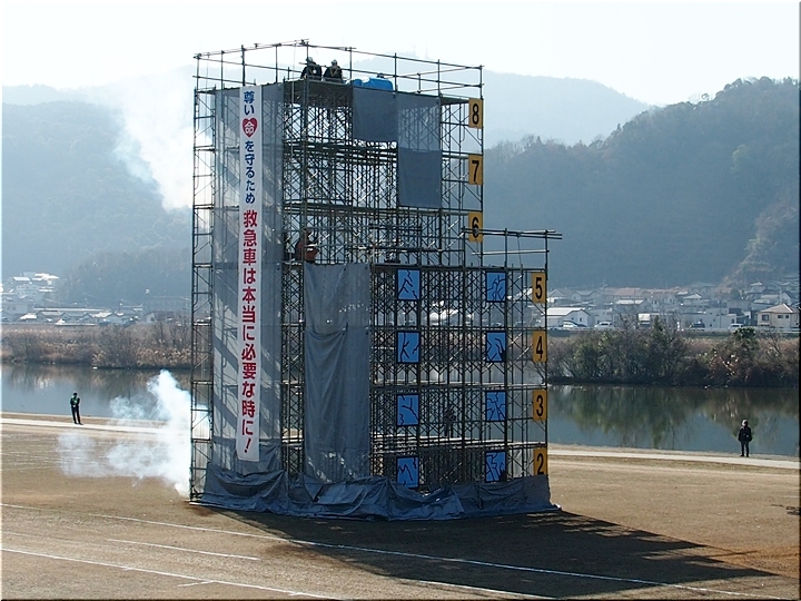 車輌追突事故の救助訓練に続いて、今度は、高層ビル火災が発生ですネ。これまたチビッコの皆さんには楽しいハシゴ車が出動となりました。
