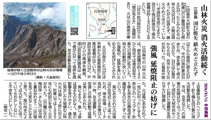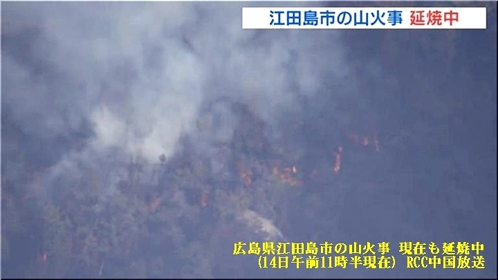 高層ビル火災では、広島県防災航空隊のヘリコプターも消火訓練に加わりますけど、今回は、昨日(1/13)江田島市の山林火災が発生し、1/14となりましても140f焼失し鎮火の目途立たず、朝から山林火災の消火活動を再開です。