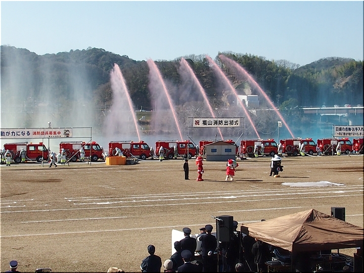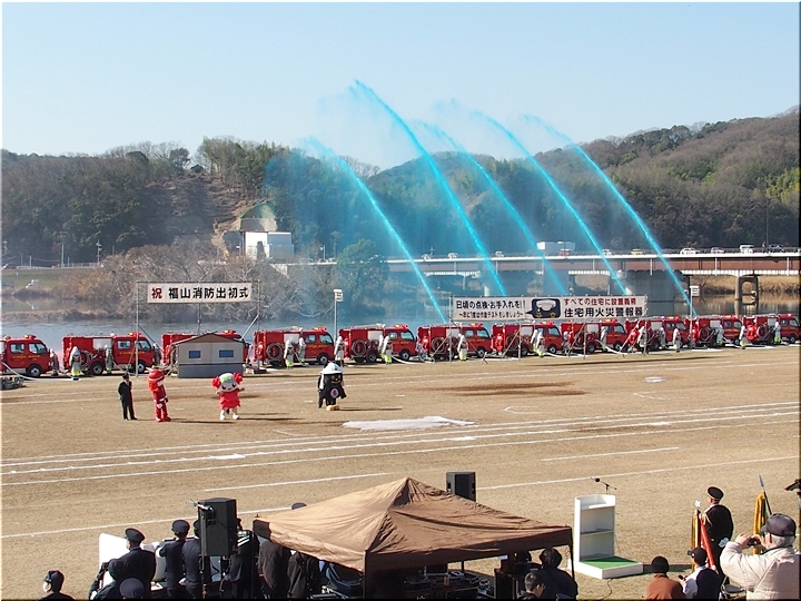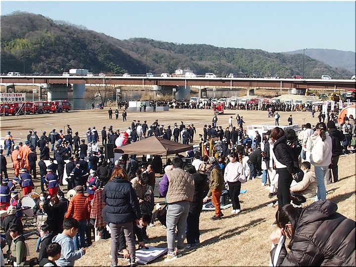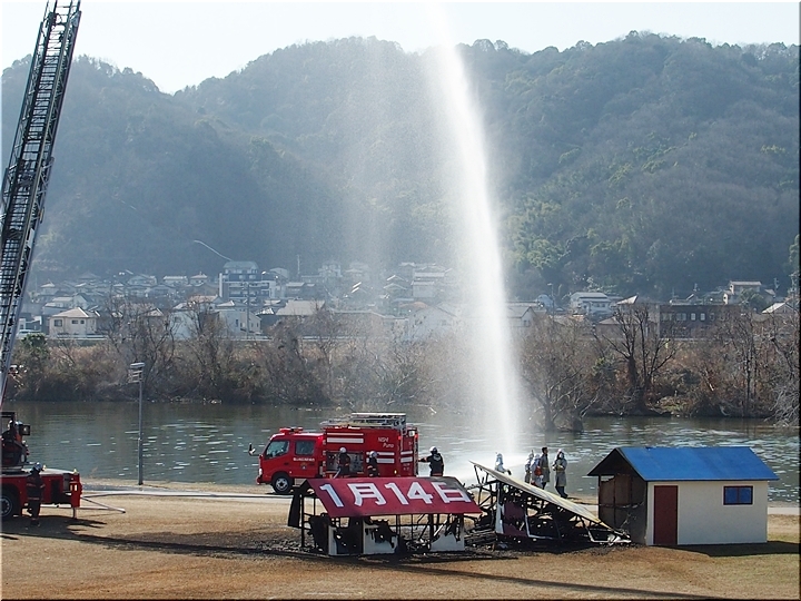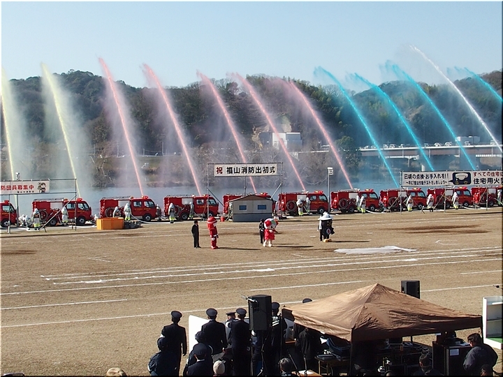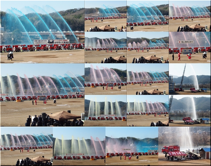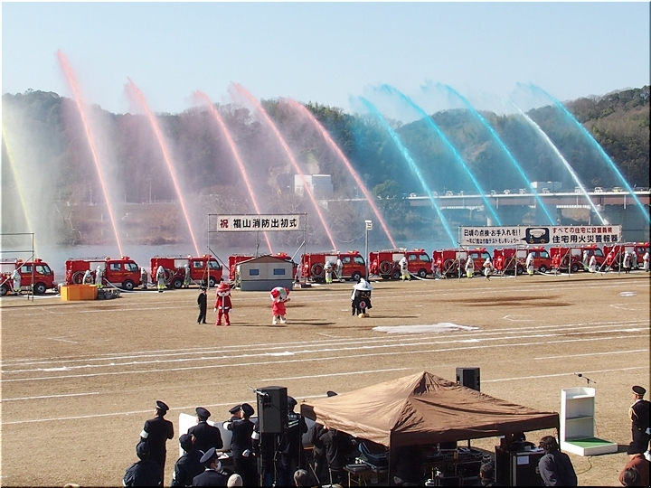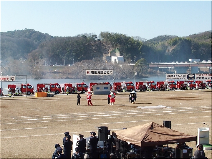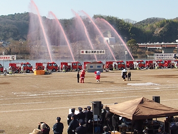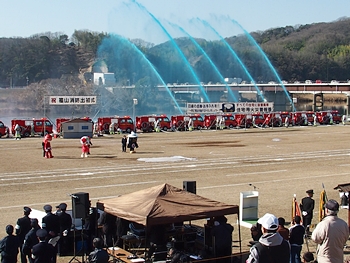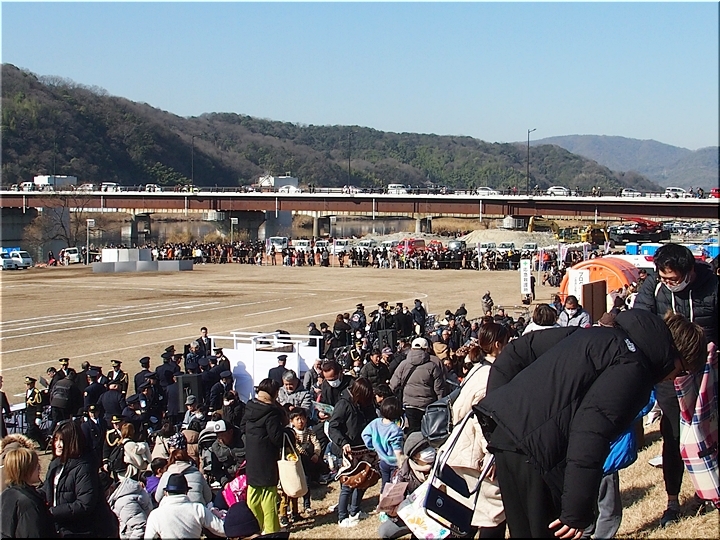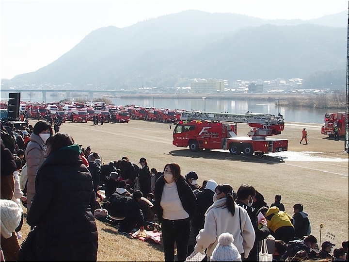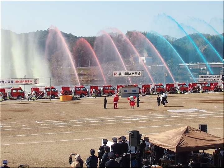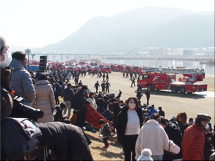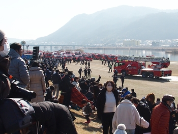 一斉放水≠ェ終わりますと出初め式も閉会で、皆さん、河川敷から退散です。風もありませんし寒くもありません天候で、参加されました消防関係者の皆様・見物者にとりましては、最高の環境でありました(^-^)//"