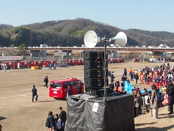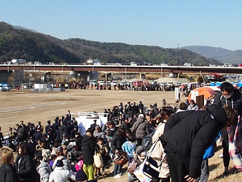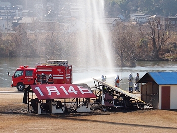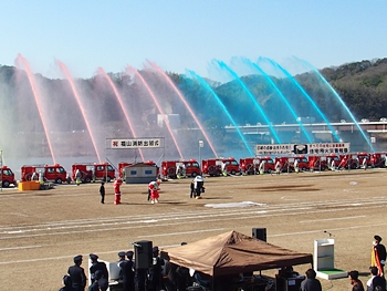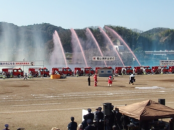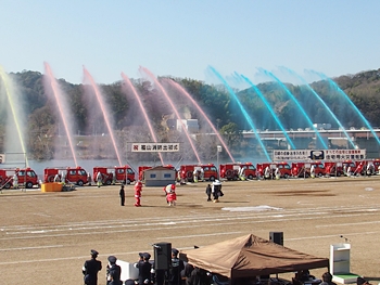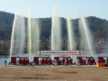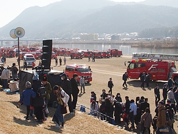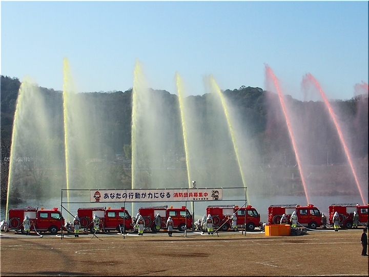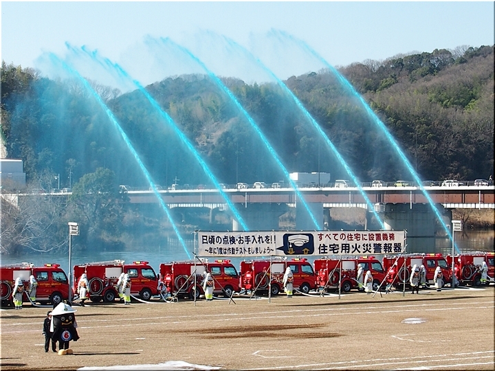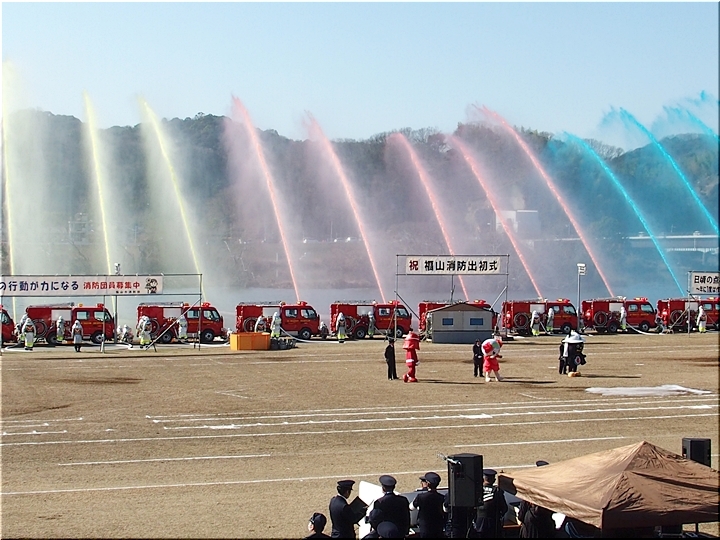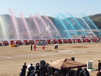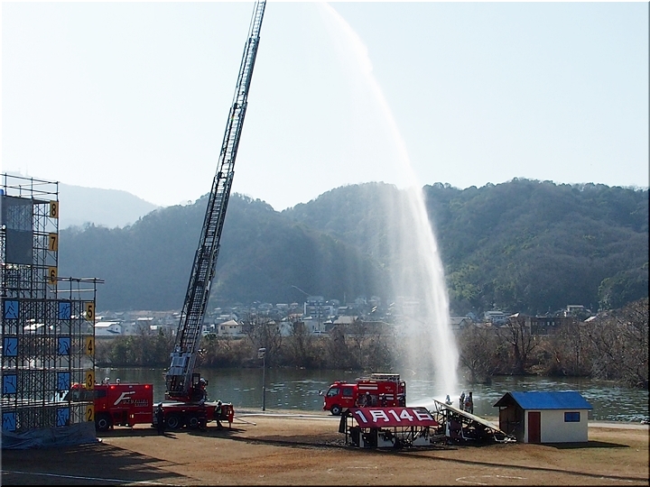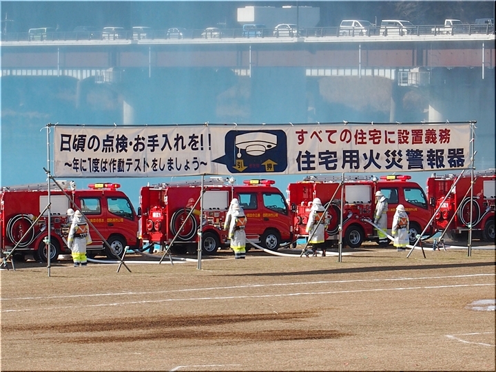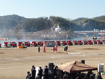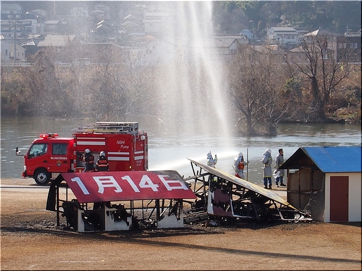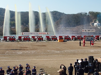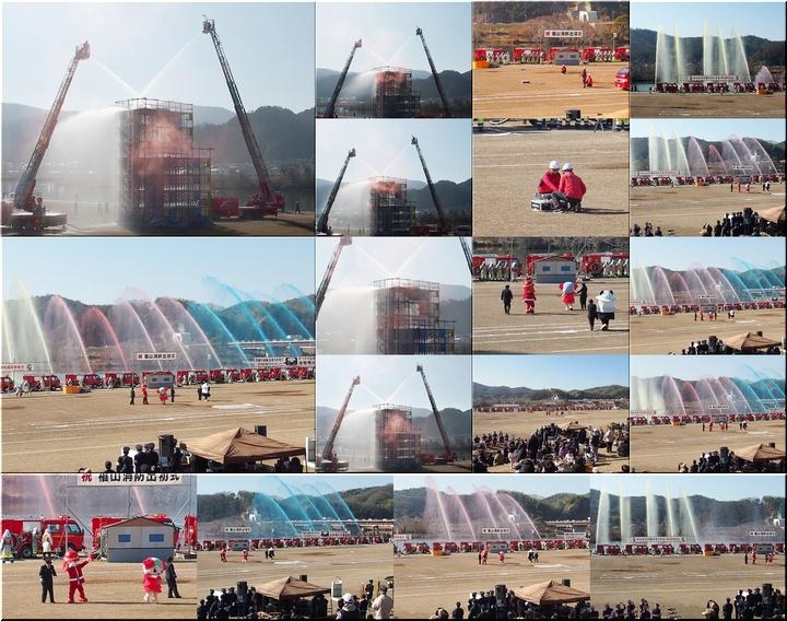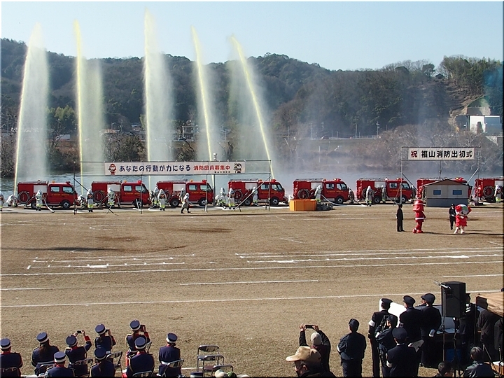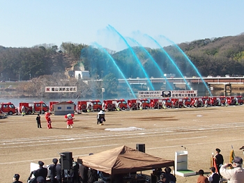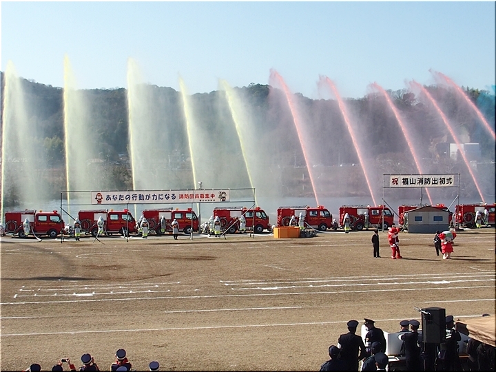 一斉放水≠ェ終わりますと出初め式も閉会で、皆さん、河川敷から退散です。風もありませんし寒くもありません天候で、参加されました消防関係者の皆様・見物者にとりましては、最高の環境でありました(^-^)//"