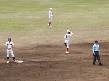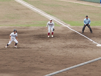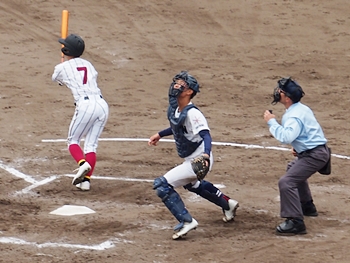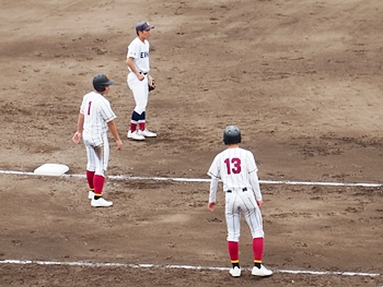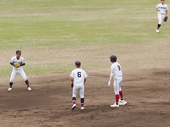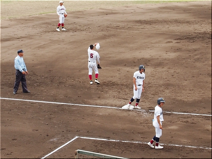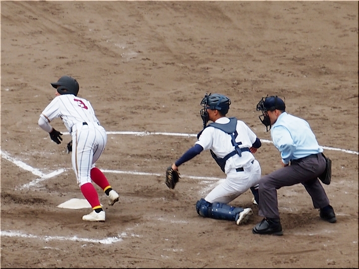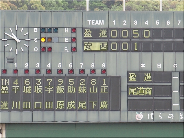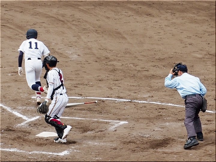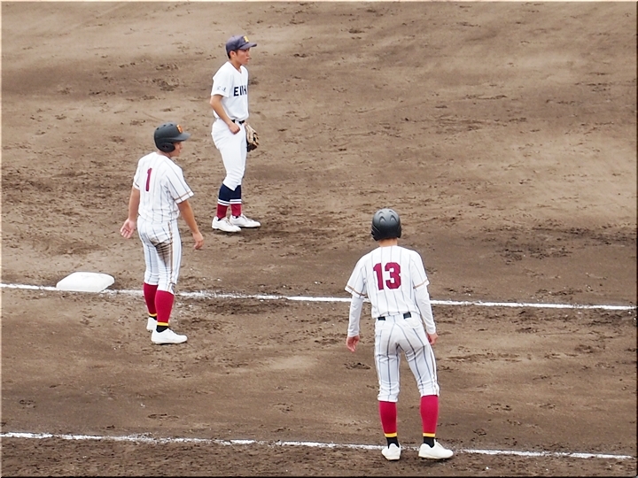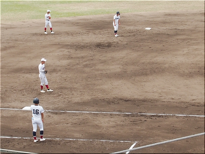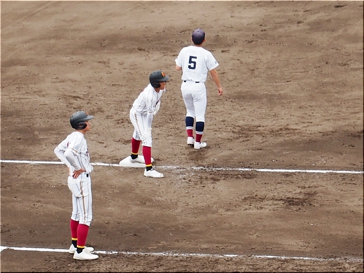 結局、2点タイムリーで「盈進5×0安西」と5点リードの盈進高校。その裏の安西高校も反撃です。2塁打の走者を3塁に送り、まずは1点を狙います。