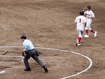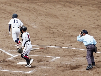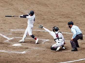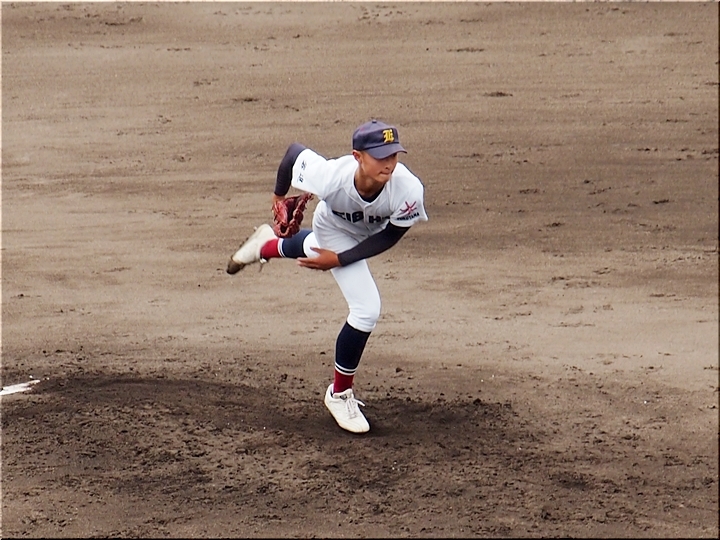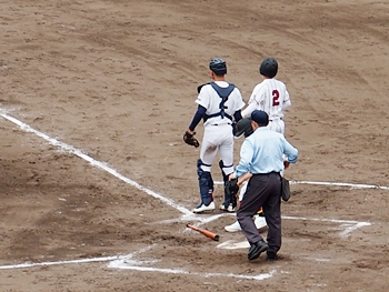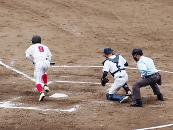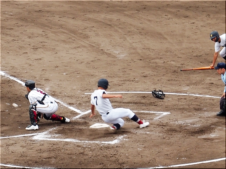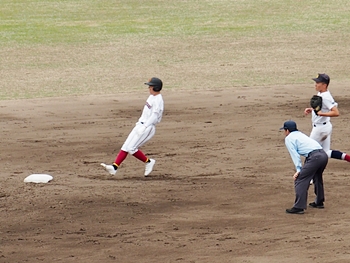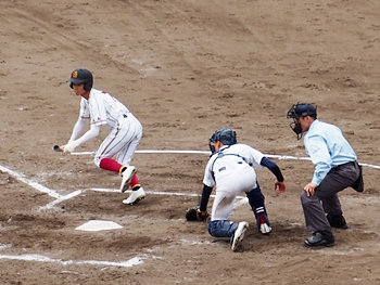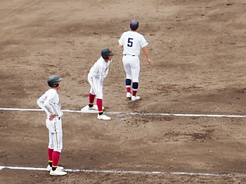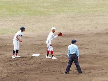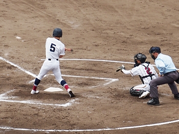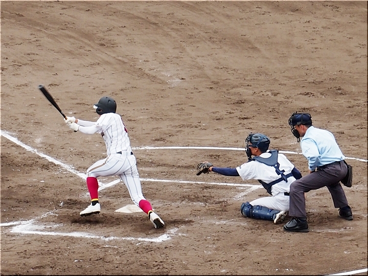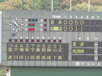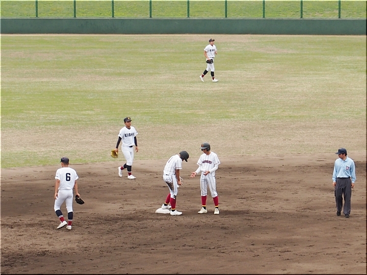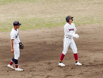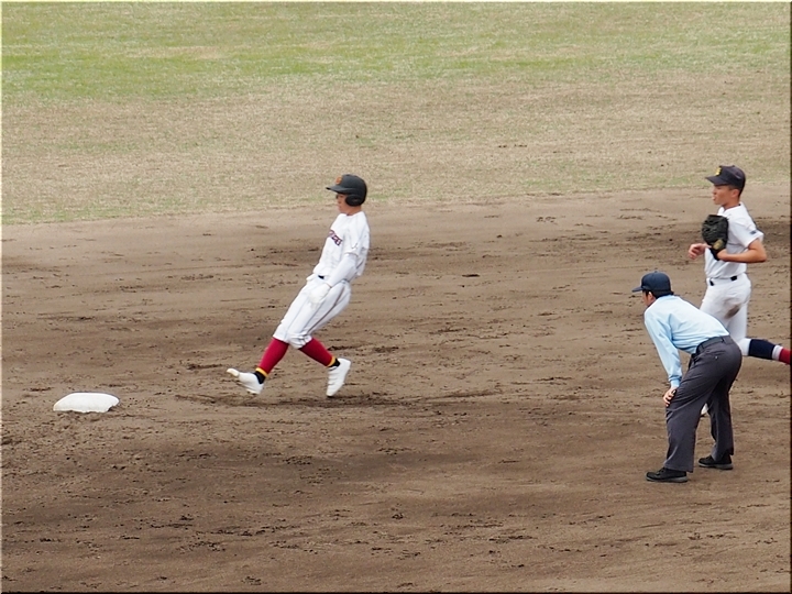 結局、2点タイムリーで「盈進5×0安西」と5点リードの盈進高校。その裏の安西高校も反撃です。2塁打の走者を3塁に送り、まずは1点を狙います。