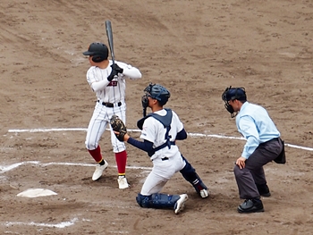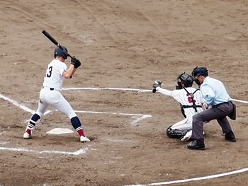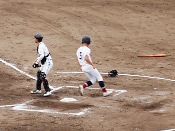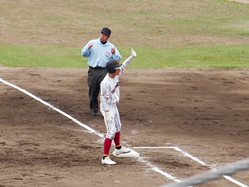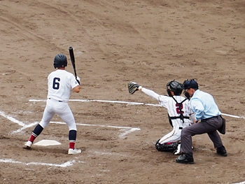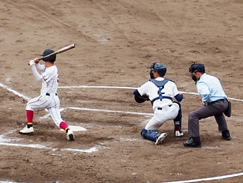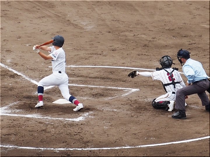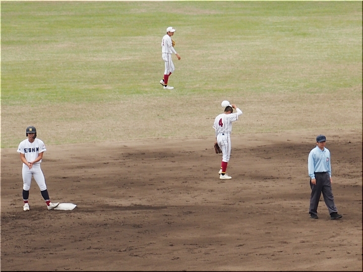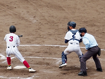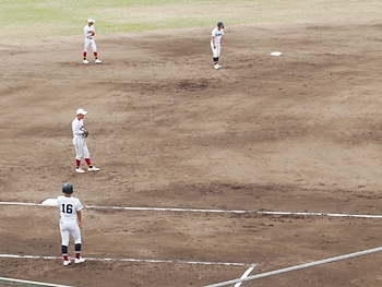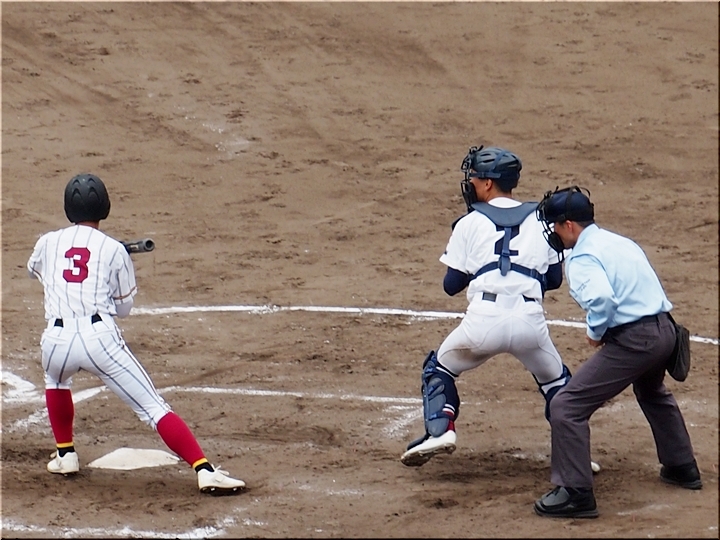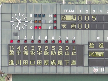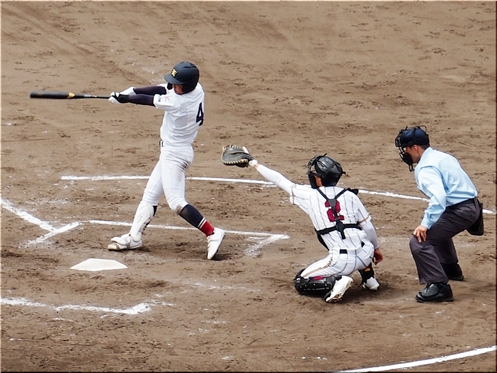 1点返して4点差とした安西高校ですけど、この回は1点止まり。続く4回の盈進高校は無得点。その裏の安西高校、1塁走者を3塁まで進め、またまた得点チャンス到来です。