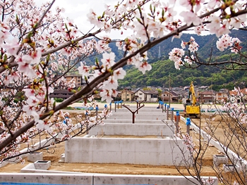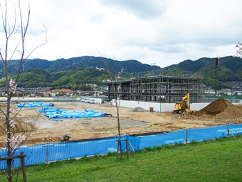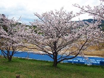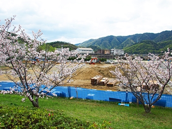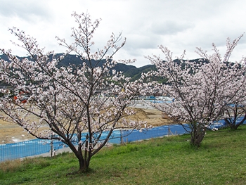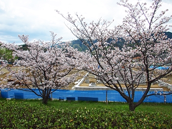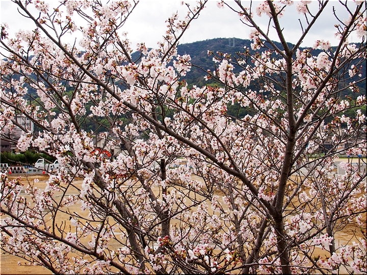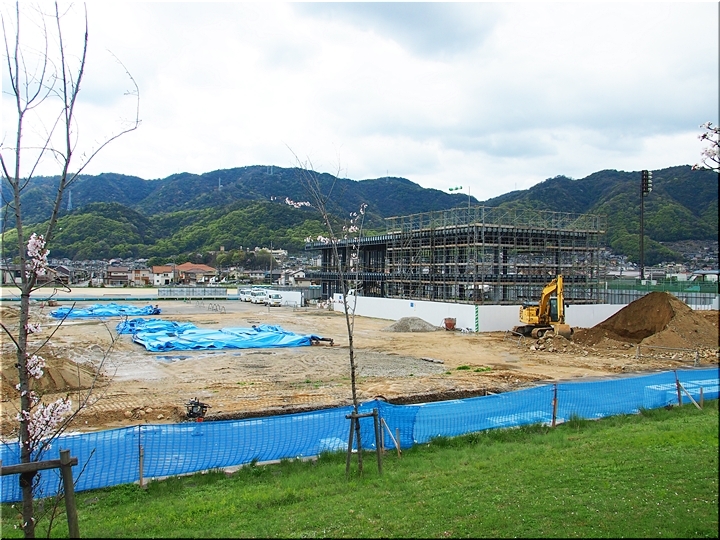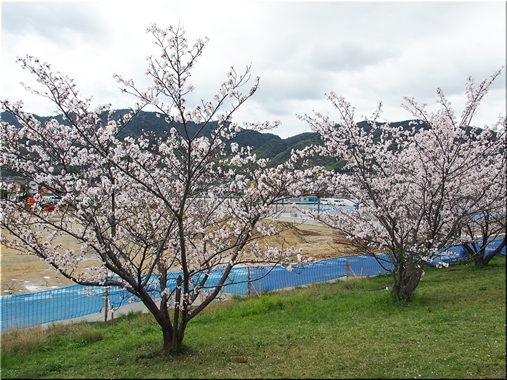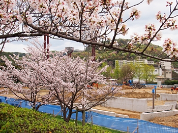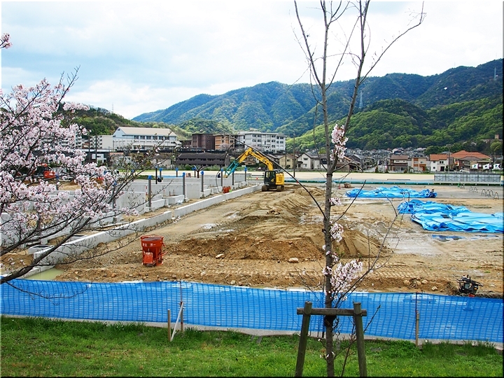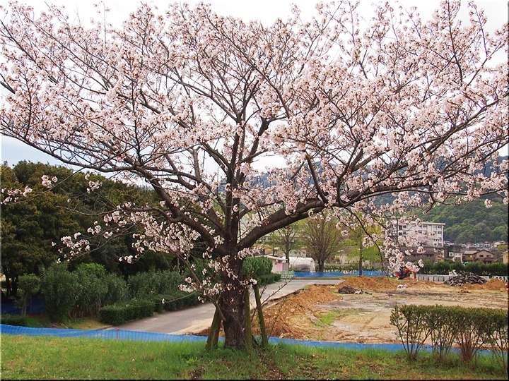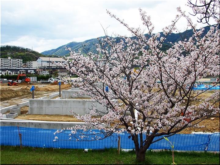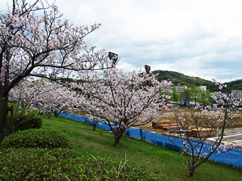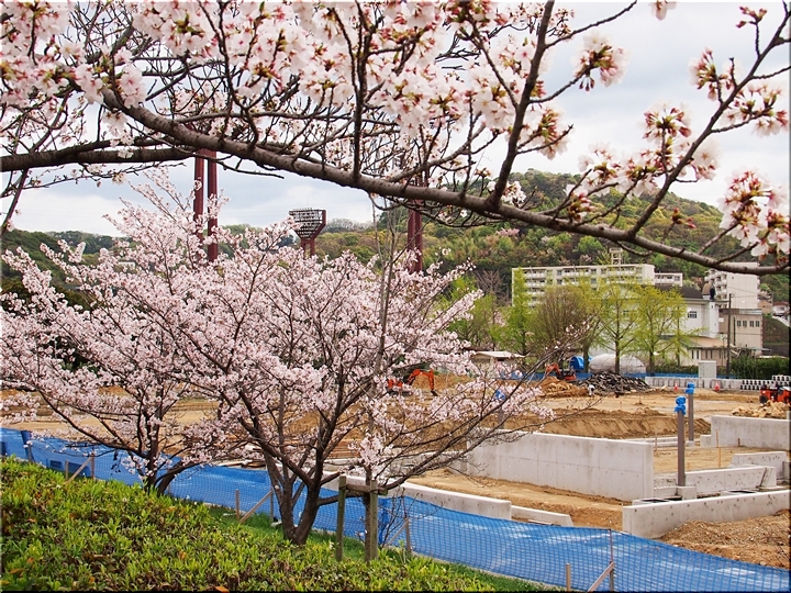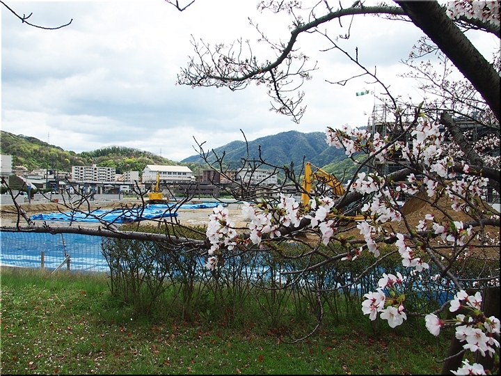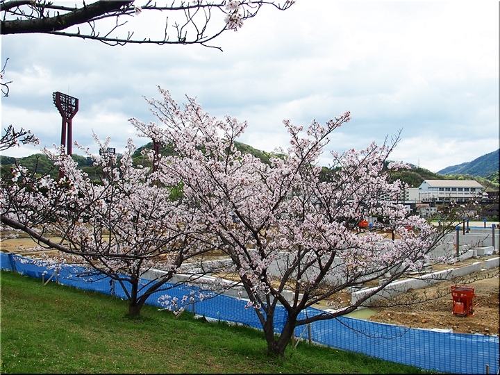 テニスコートと土手の間に設けられましたウォーキングロードのサクラ並木ですから、こぅして画像に納めておりますと、工事中のテニスコートにも眼が向いてしまいます(^-^)