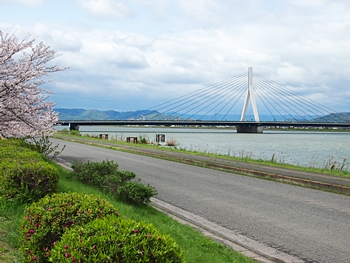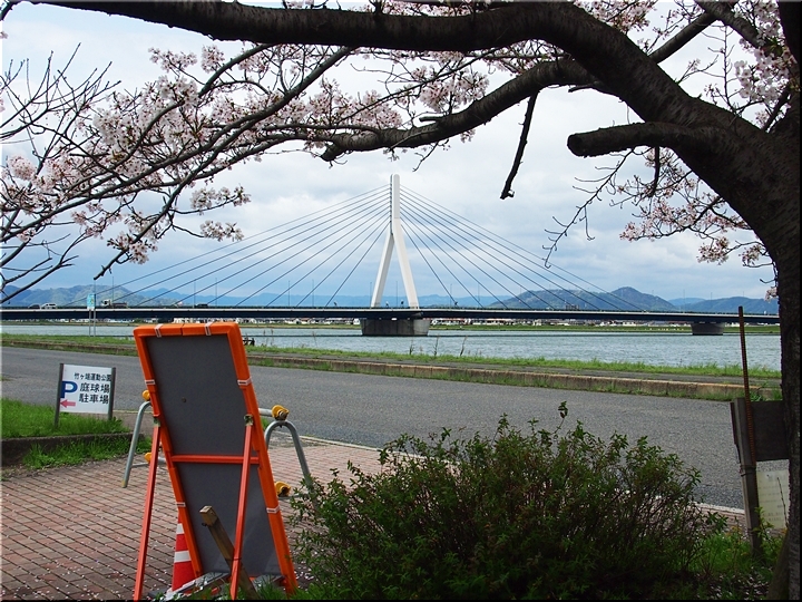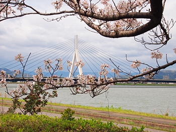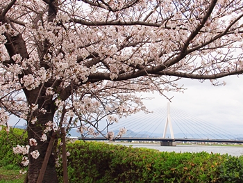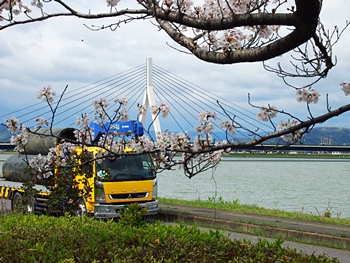 芦田川大橋主塔を背景にサクラをパチリ…となりましたけど、タイミング良くトラックが…再度、パチリとなりました(^-^)//"