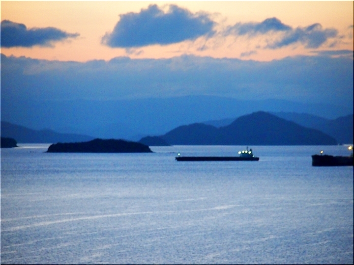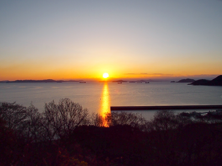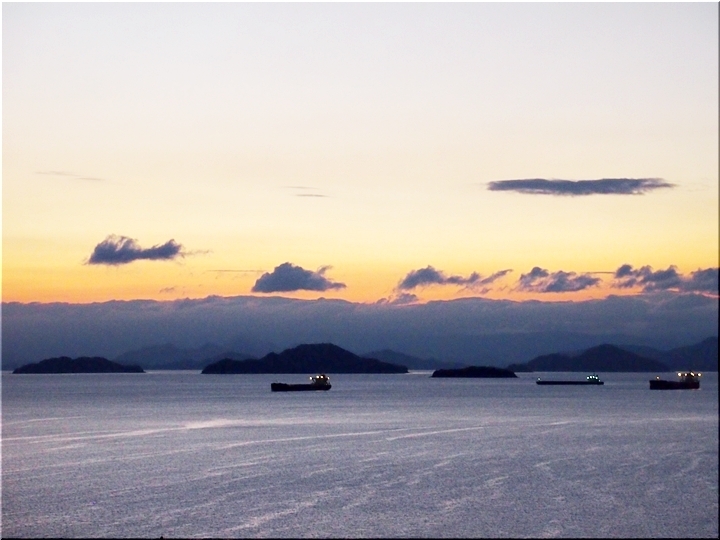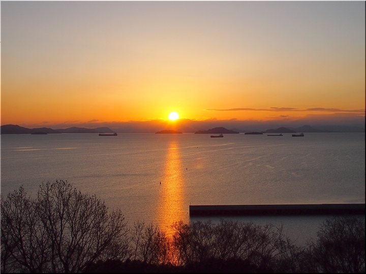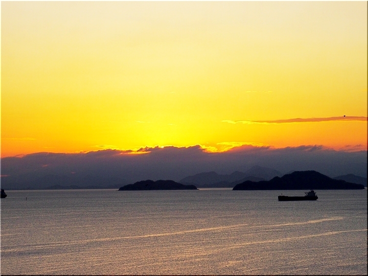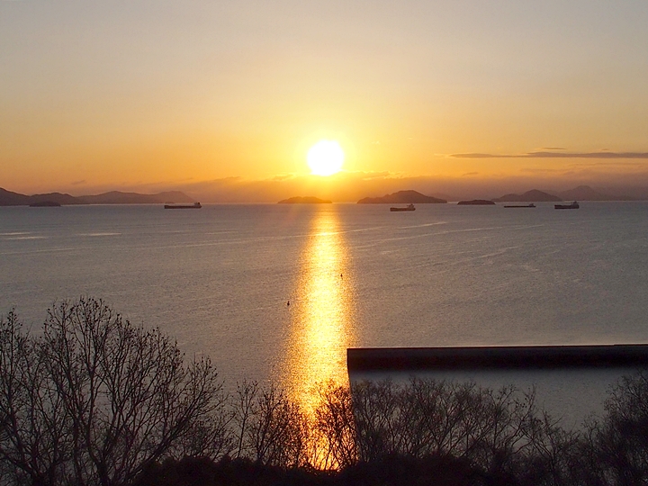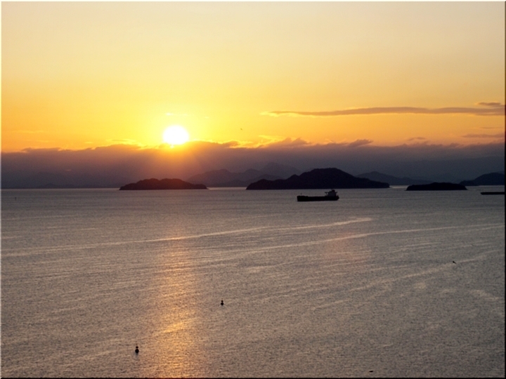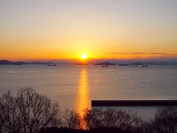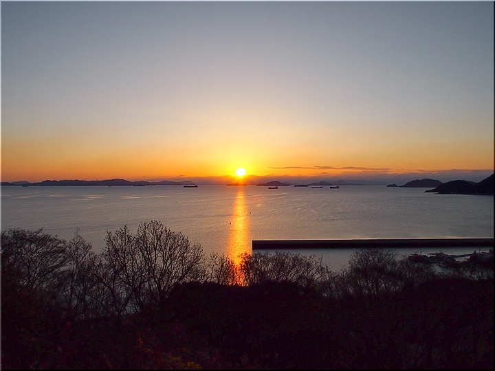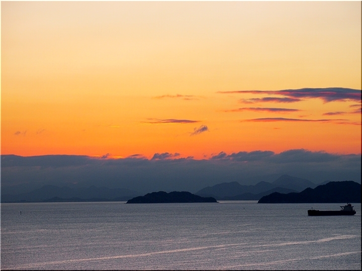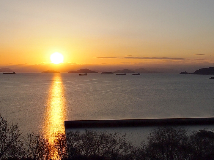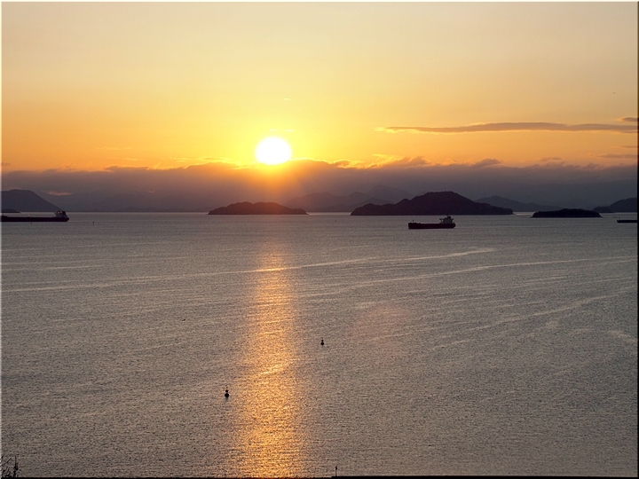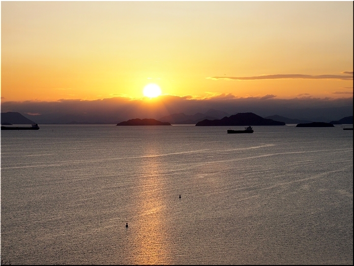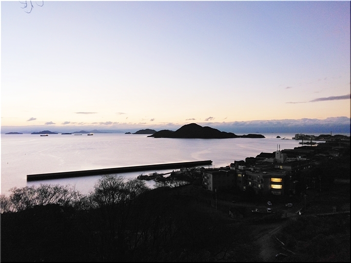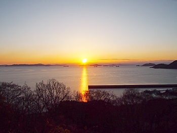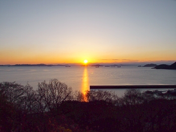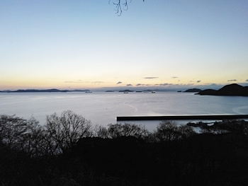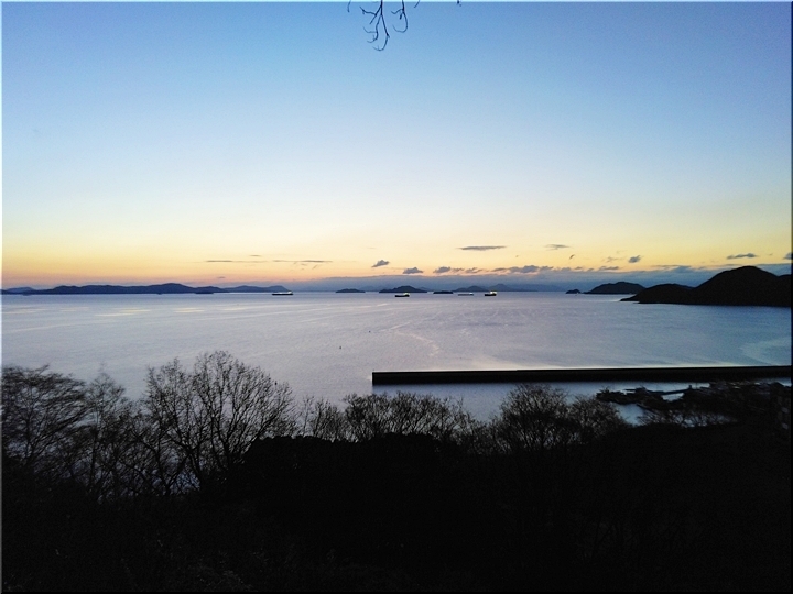 この睦の丘≠ゥら瀬戸内を臨みますと、丁度、正面には笠岡諸島の白石島∞北木島≠ェ。この上空に日の出となりますけど、姿を現しますのも間もなくです。島の上空が随分明るくなって来ましたから(^-^)