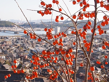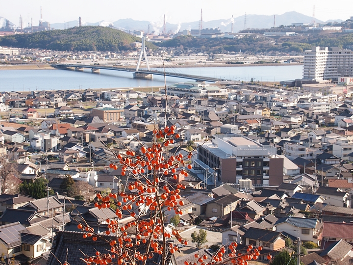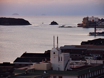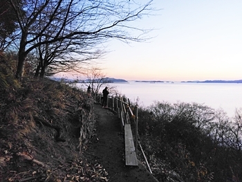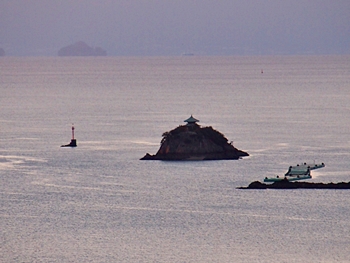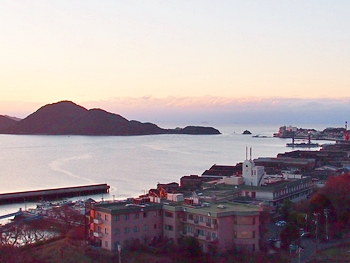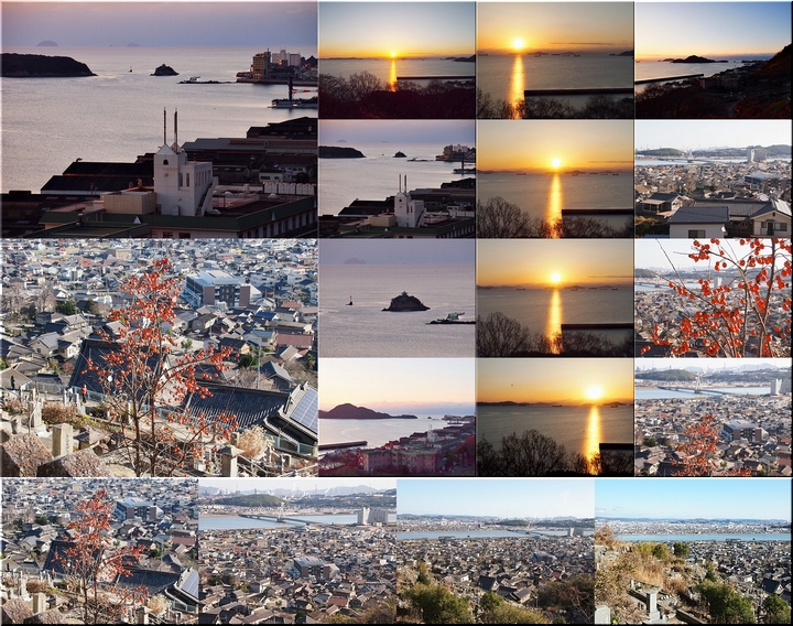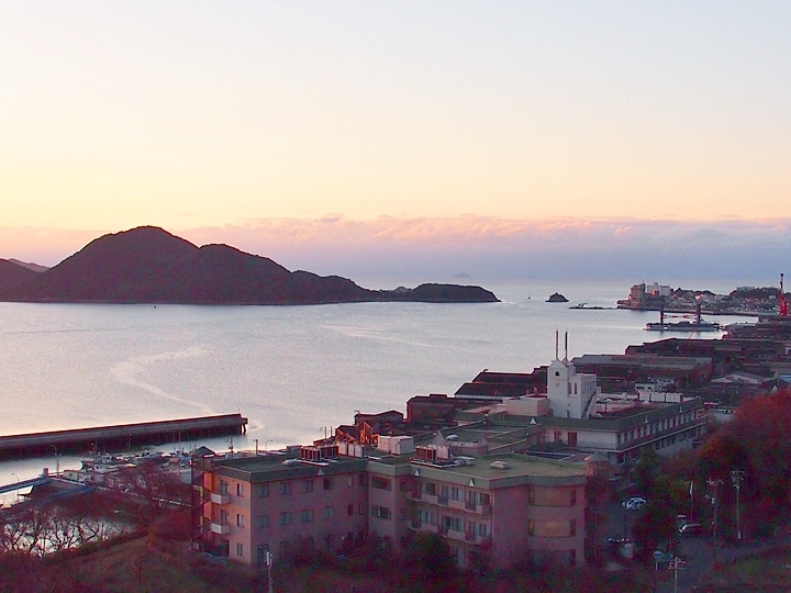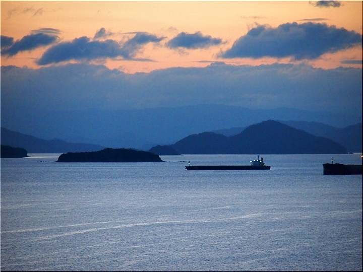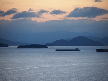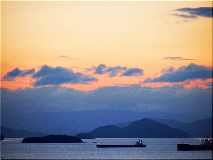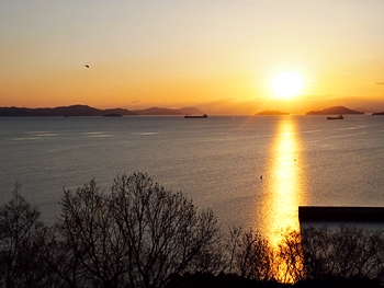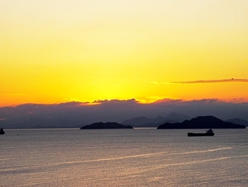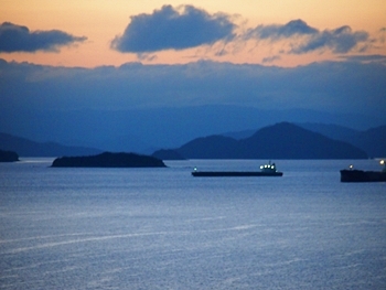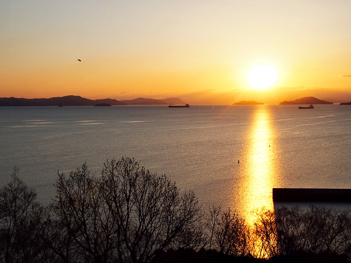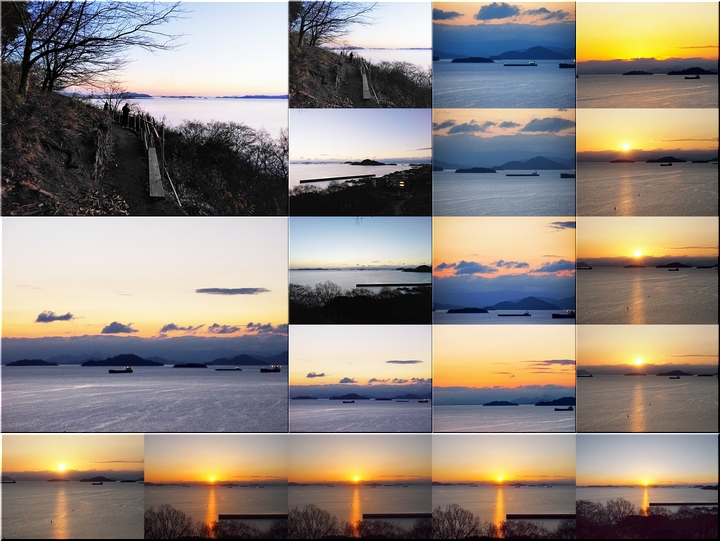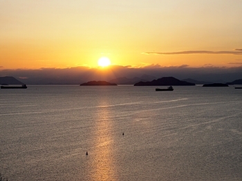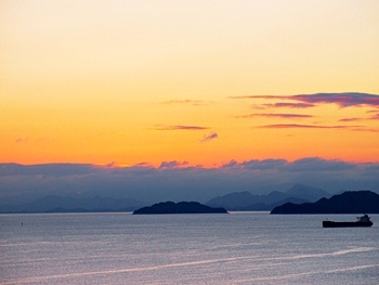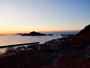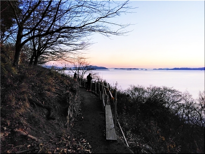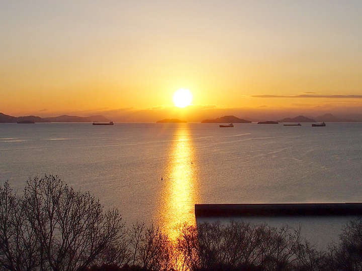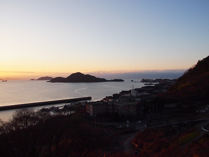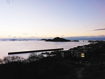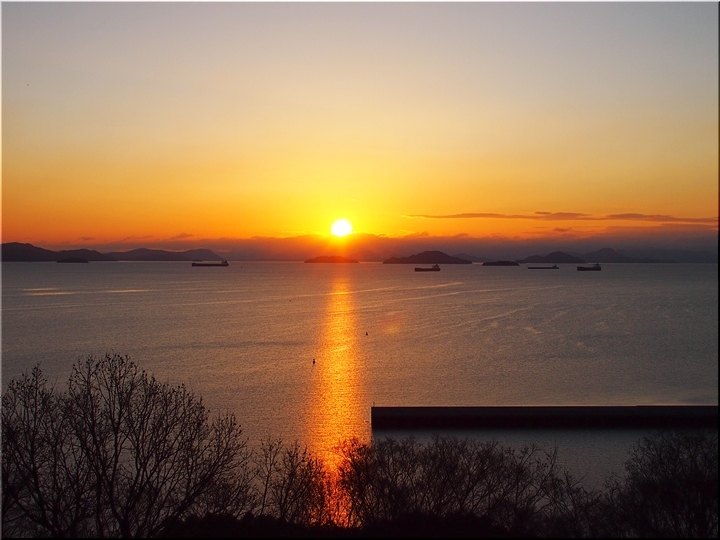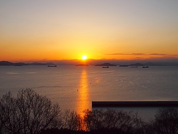 この睦の丘≠ゥら瀬戸内を臨みますと、丁度、正面には笠岡諸島の白石島∞北木島≠ェ。この上空に日の出となりますけど、姿を現しますのも間もなくです。島の上空が随分明るくなって来ましたから(^-^)