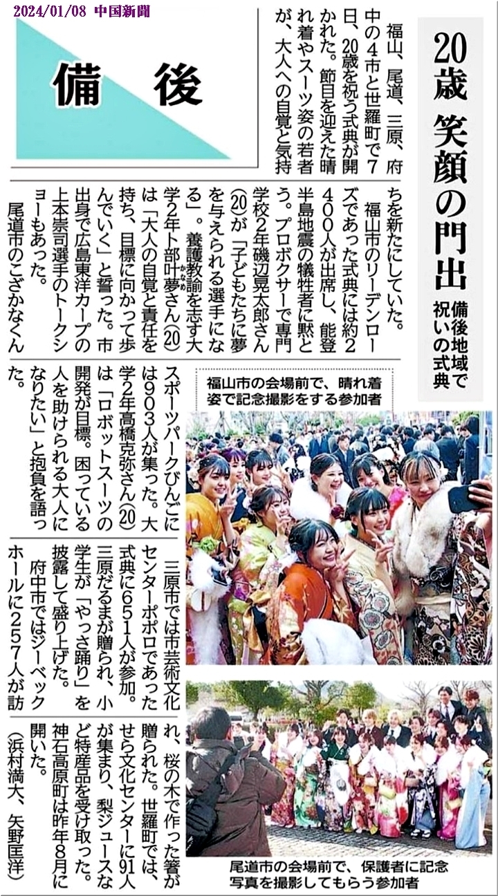 大人への仲間入りで、今日からまた新たな気持ちで再出発ですネ。やはり、福山市は昨日が「成人式」でありましたようです。