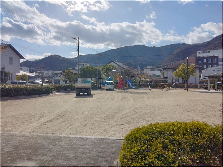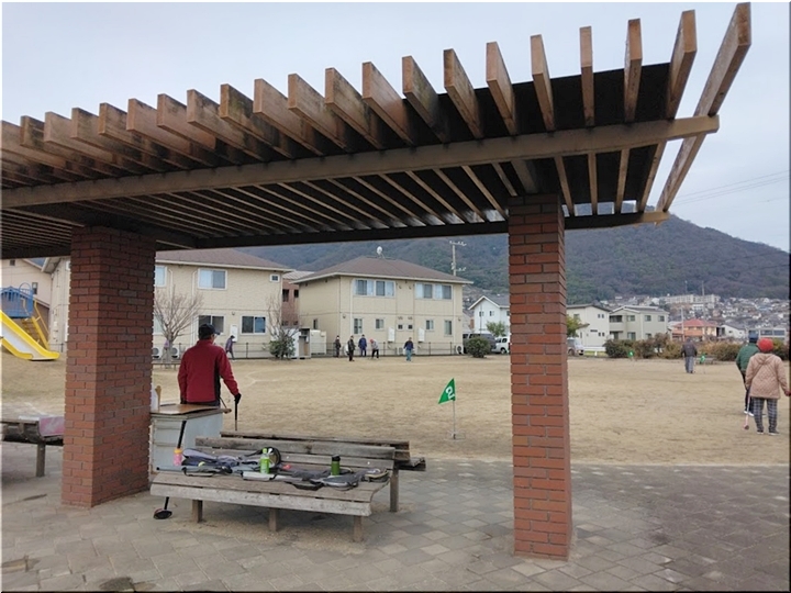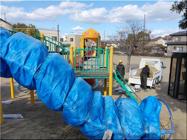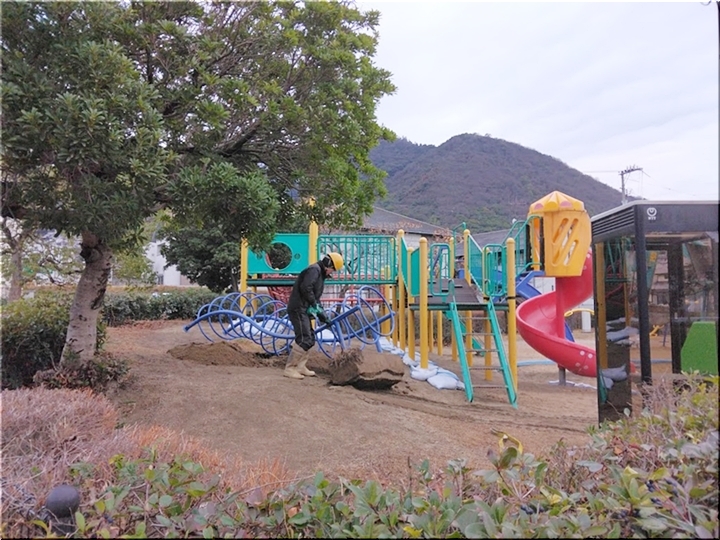 昨日、市の担当者の方と打ち合わせしておられましたけど、今から、この遊具の下部の基礎部分の、コンクリートが露出部分に盛り土をし、公園利用者が転倒してコンクリート部分の角で負傷しないよう危険防止措置を行うとの事でありました。