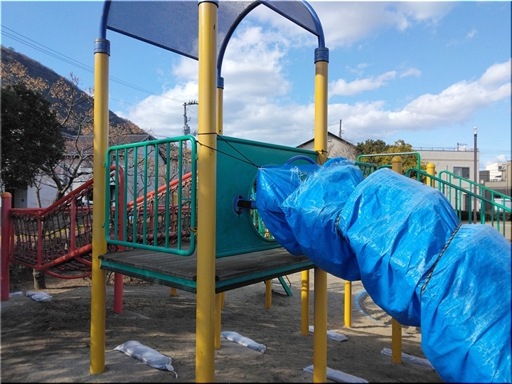 〝浜あおむし公園〟の〝輪くぐり遊具〟も危険遊具となりますから、いずれ撤去の運命にありますとか…今暫くは、こぅしてブルーシートを掛け使用出来ない状態にし対応との事であります。