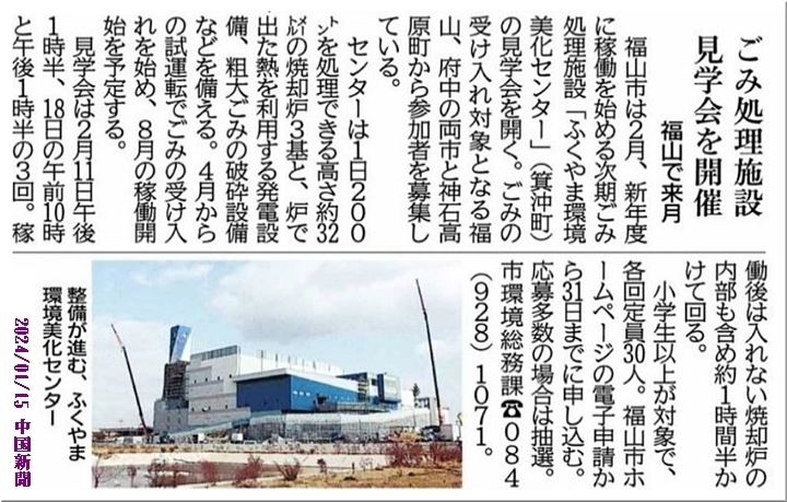 今朝の中国新聞朝刊紙上に、「〝ふくやま環境美化センター〟見学会開催」の記事掲載が(^-^)