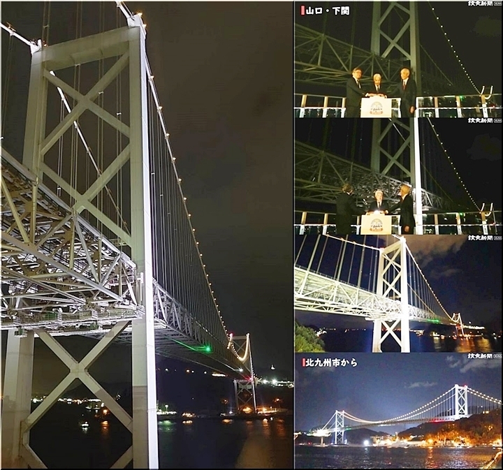 開通50年を前に、白熱電球からLED照明に設備を更新することになり、約1年半、ライトアップを中止していた。12日夜には下関市の壇之浦パーキングエリアで点灯式が行われ、主塔部分の約40個のライトが一斉にともされた。