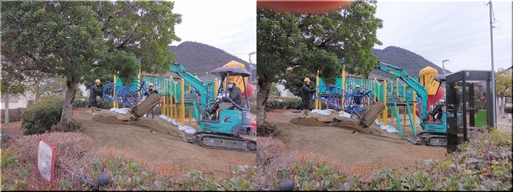 ユンボの爪先で基礎部分を何度か掘削しますと、遊具の輪の部分に作業紐を通し、この紐を爪先で持ち上げますと、いとも簡単に輪くぐりの部分は遊具本体から分離となりました。