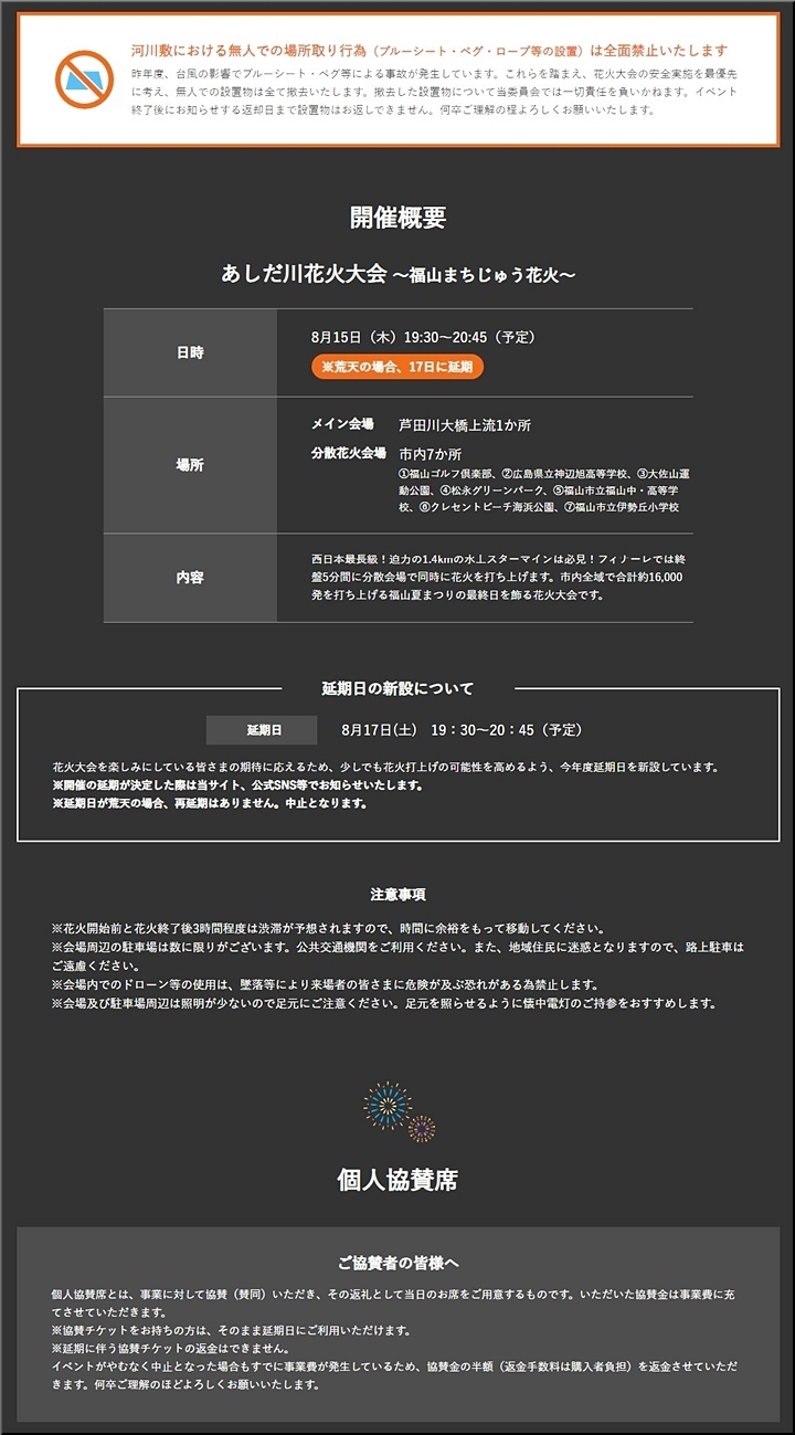 何度も中止が続きますと、主催者も善後策を検討で、今回は、8/15(木)に開催不能となりましたら8/17(土)に延期で対応のようであります(^.-)☆